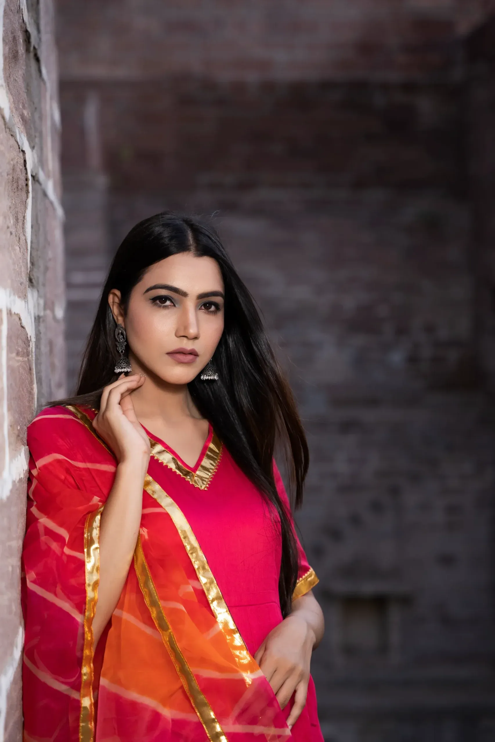 Style this Anarkali with statement jhumkas or kundan earrings to highlight its festive elegance. Finish the look with traditional juttis or embroidered heels and a sleek low bun or soft waves to let the flare and zari detailing take center stage.
