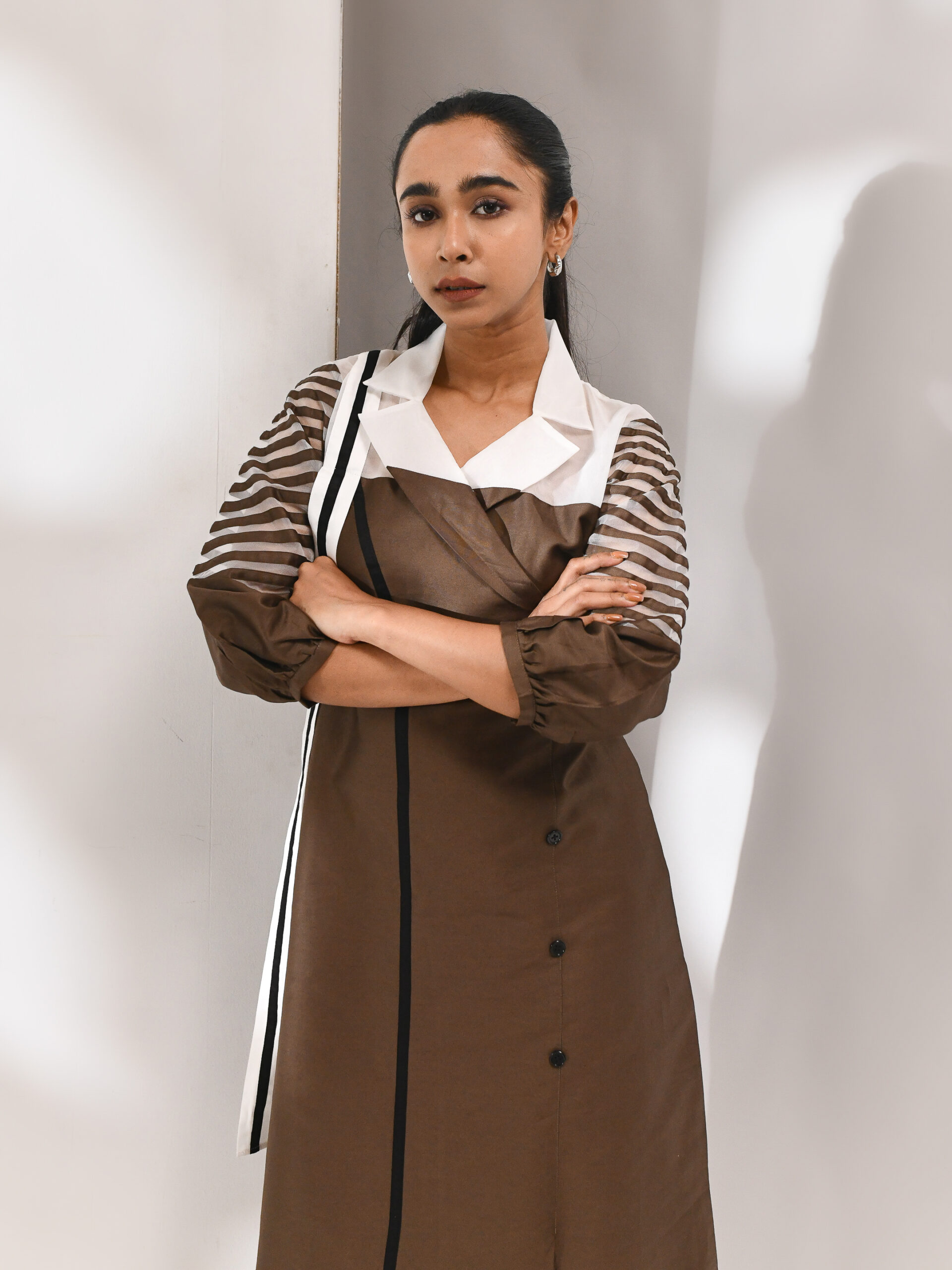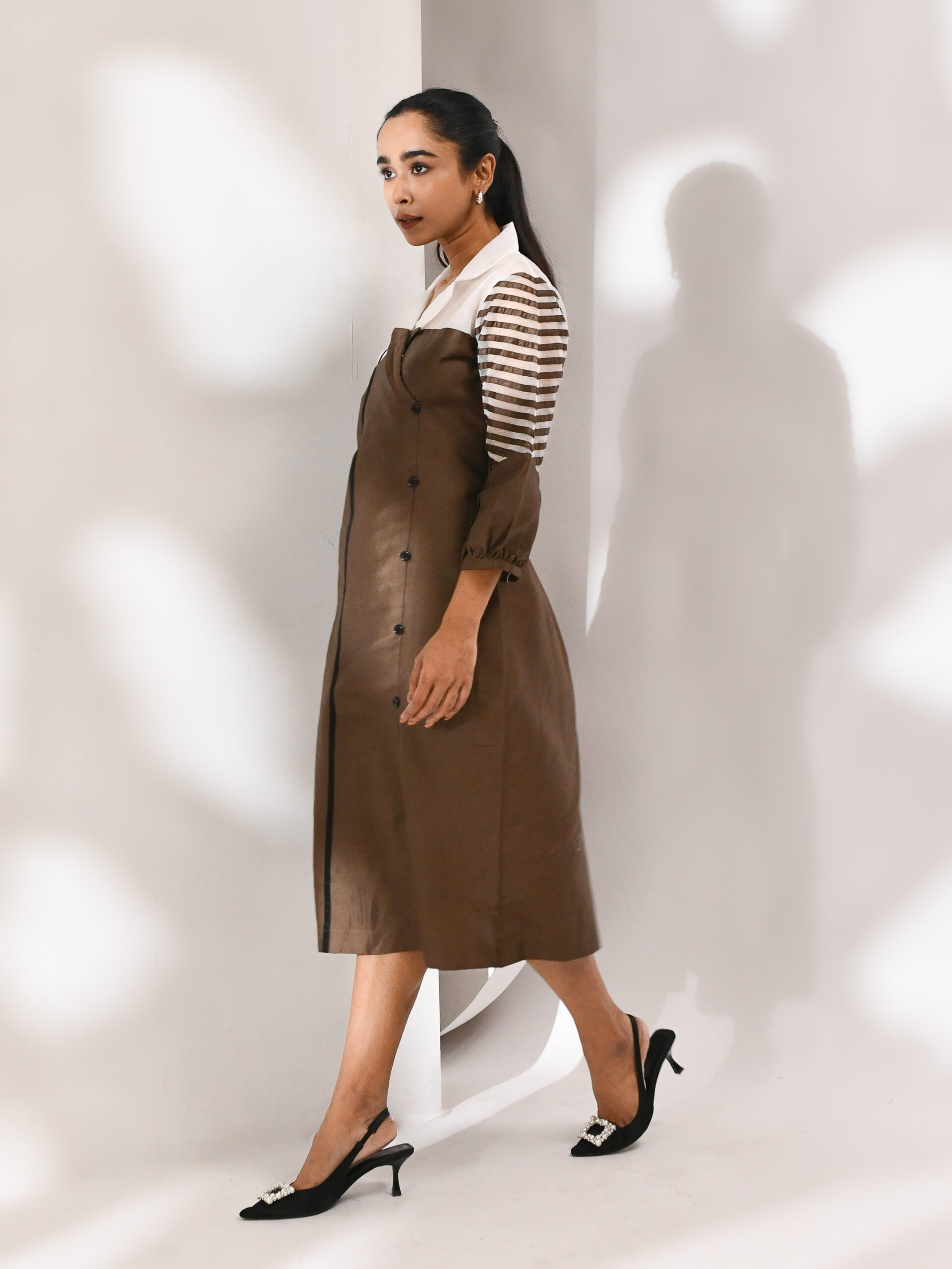 Ash Brown Cotton Dress With Sheer Organza Shoulders