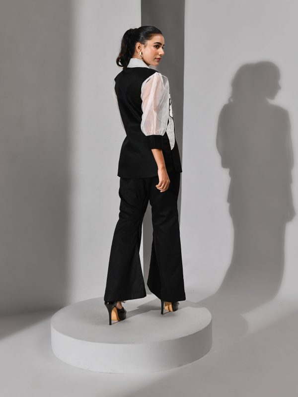 Introducing our black and white cotton co-ord set, a modern expression of timeless elegance. Crafted from soft, breathable cotton, this two-piece ensemble blends architectural precision with poetic softness — perfect for everyday sophistication or elevated occasions. The black cotton top is adorned with delicate white floral patchwork and intricate threadwork, blooming like moonlit petals across a midnight canvas. Paired with panelled leg pants that elongate the silhouette, the set creates a harmonious balance of structure and movement.