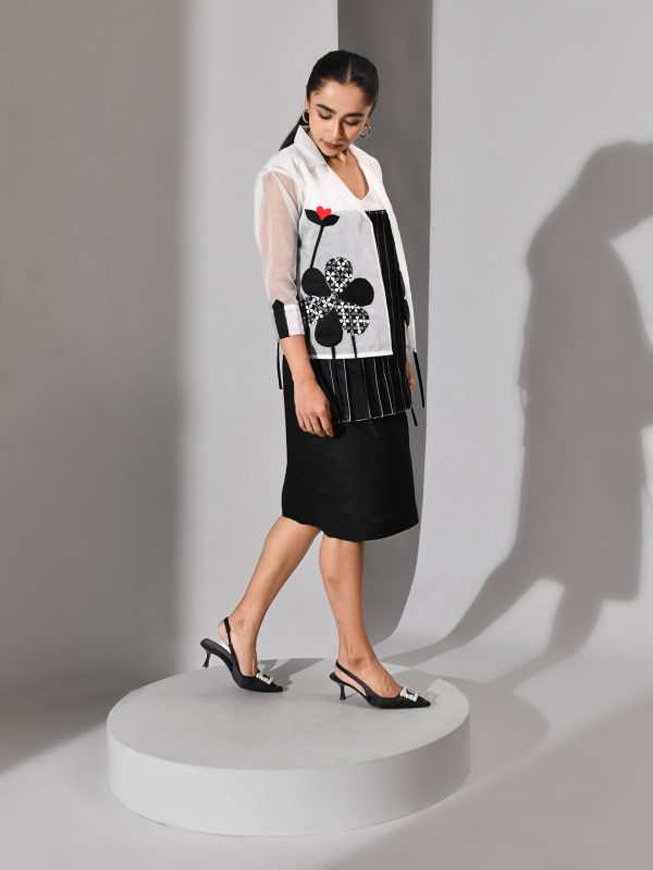 Introducing our black-and-white cotton and organza 2-piece dress with jacket — a balance of soft and strong elements. The pleated dress is paired with a lightweight organza jacket featuring embroidered black patchwork, each stitch made with care. The sheer jacket adds a delicate layer, gently covering the dress while letting its structure show through.