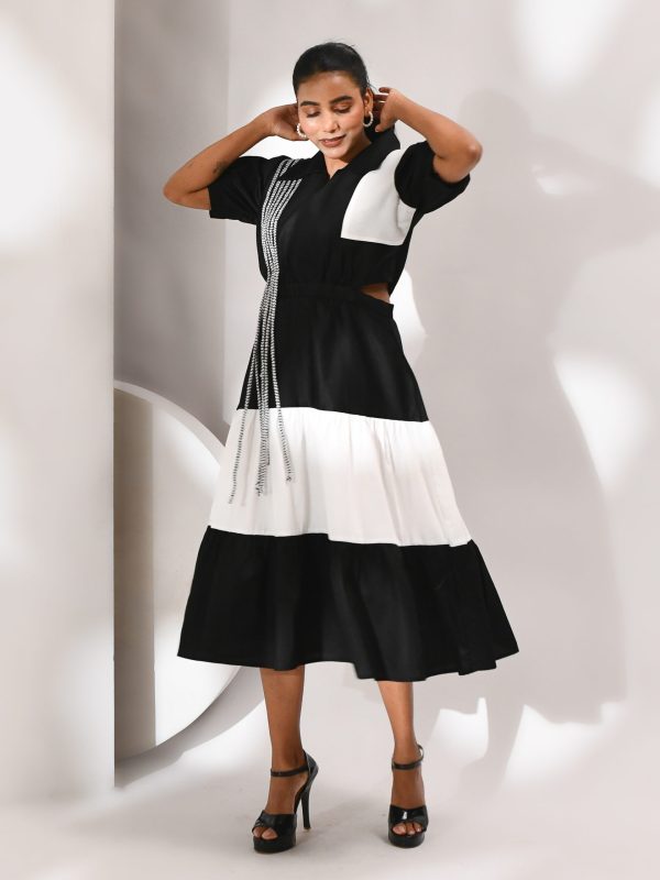 Introducing our black and white cotton dress, a monochrome masterpiece that plays with rhythm, rebellion, and refined artistry. Crafted in soft, breathable cotton, this tiered silhouette flows with sculptural grace, while side cutouts and puff sleeves add a bold, contemporary edge. The abstract dori detailing traces across the body like a sketch in motion—creating texture, intrigue, and a sense of kinetic movement.