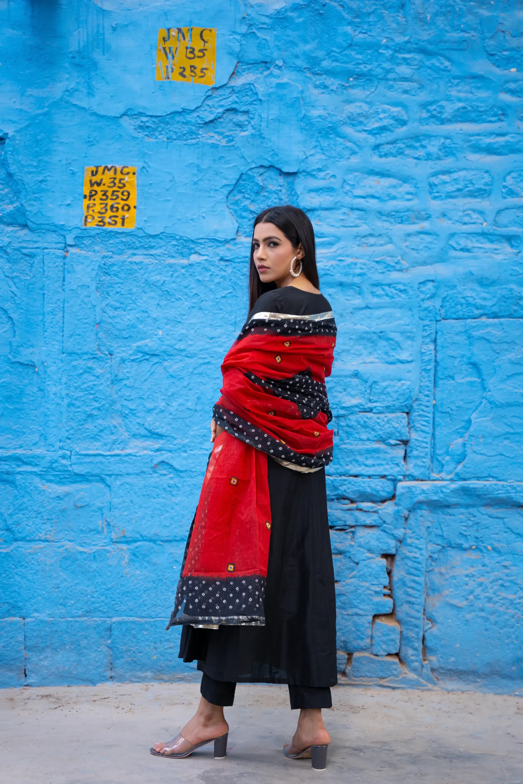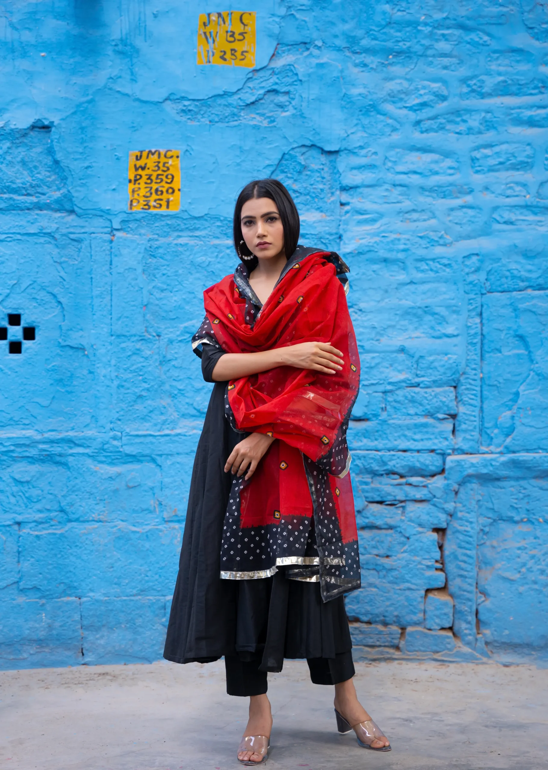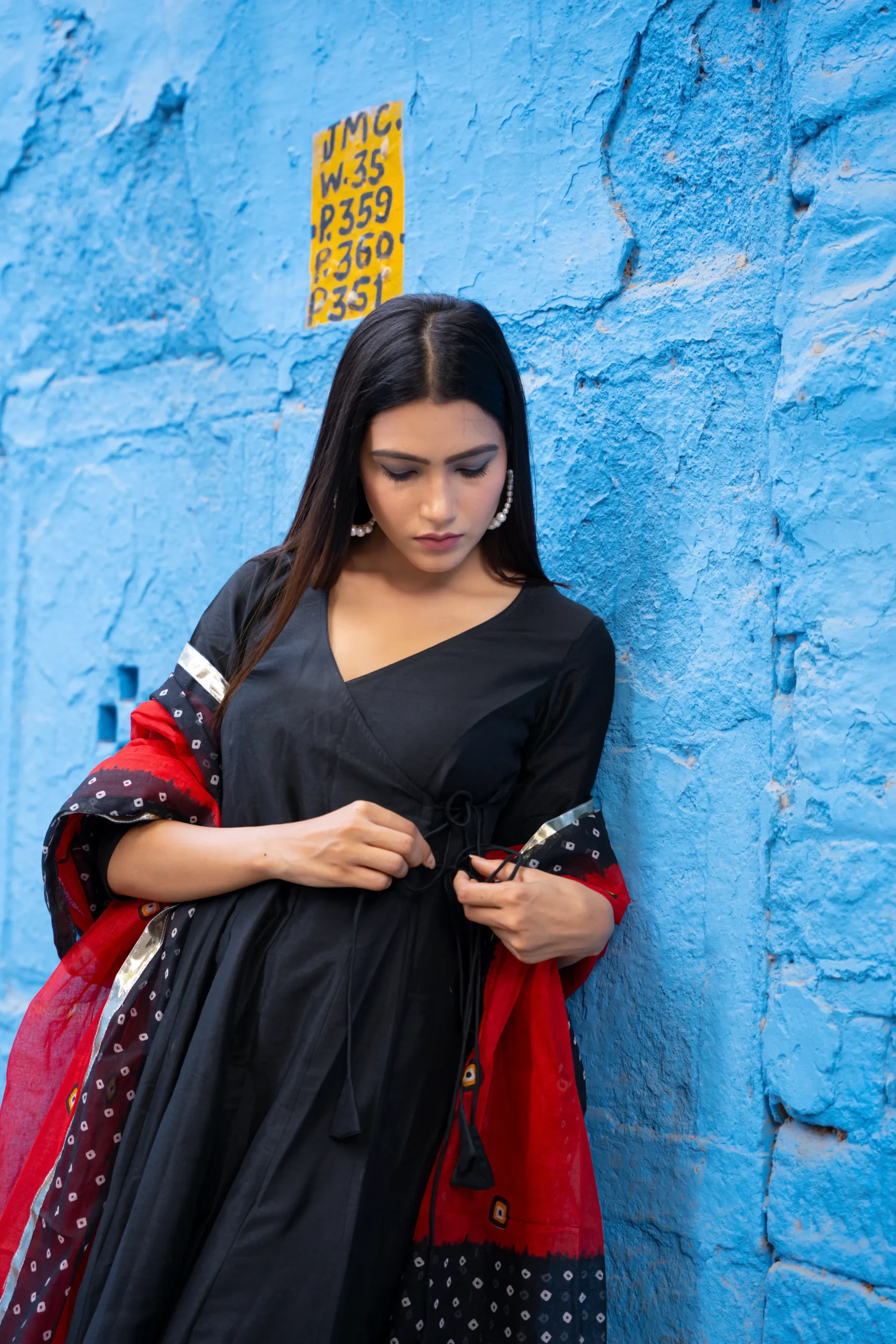 Style this elegant Angrakha suit with oxidized silver earrings or classic hoops for a contemporary ethnic look. Pair with block heels or traditional juttis, and opt for straight hair or a sleek low ponytail to let the Bandhani dupatta remain the focal point.