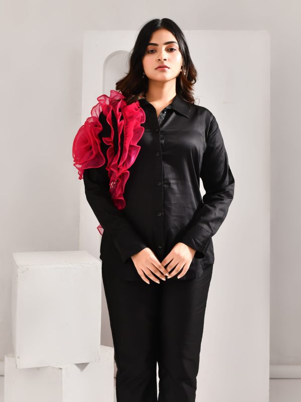Introducing the black and pink floral detailing shirt. Crafted in cotton, this contemporary statement piece reimagines the classic shirt with sculpted floral dimension and bold contrast. The vibrant pink appliqué adds striking texture and visual depth, while the black base provides a sophisticated, modern balance.