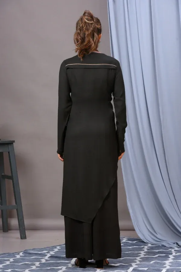 Vivek Kumar presents this stunning black cotton rayon front-open asymmetric tunic! Featuring minimal placement hand embellishments on the front, it adds a touch of richness and sophistication. The unique asymmetric hemline and zip detailing offers a modern twist, making it a standout piece in any wardrobe. Paired with black pants for a chic look.