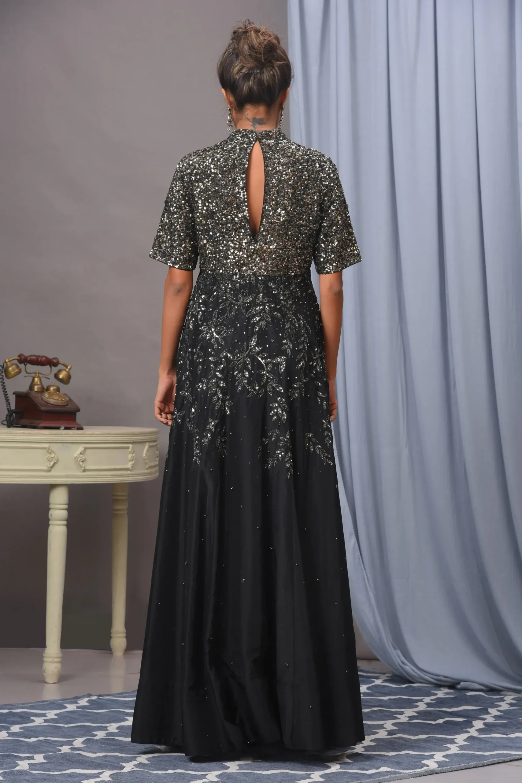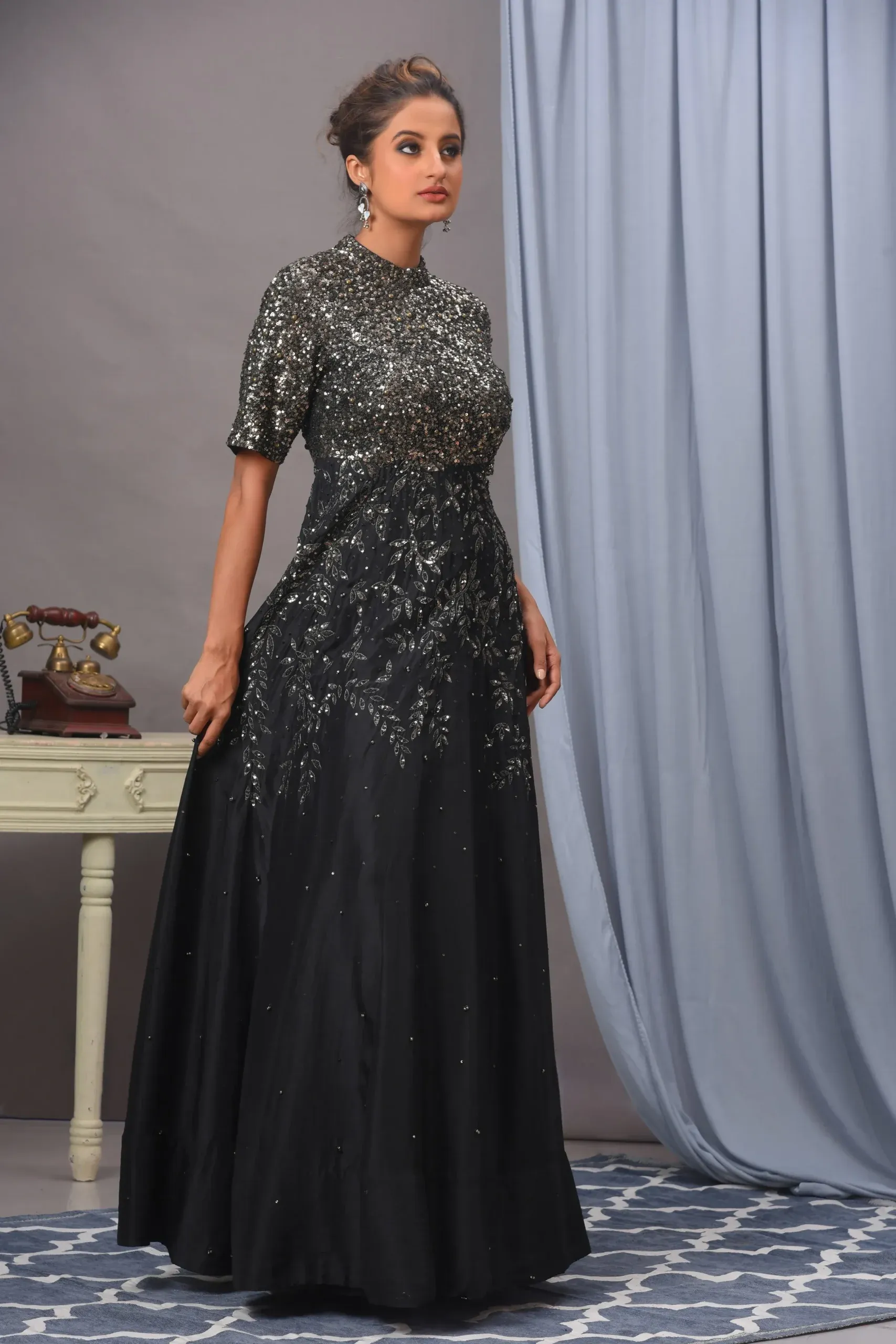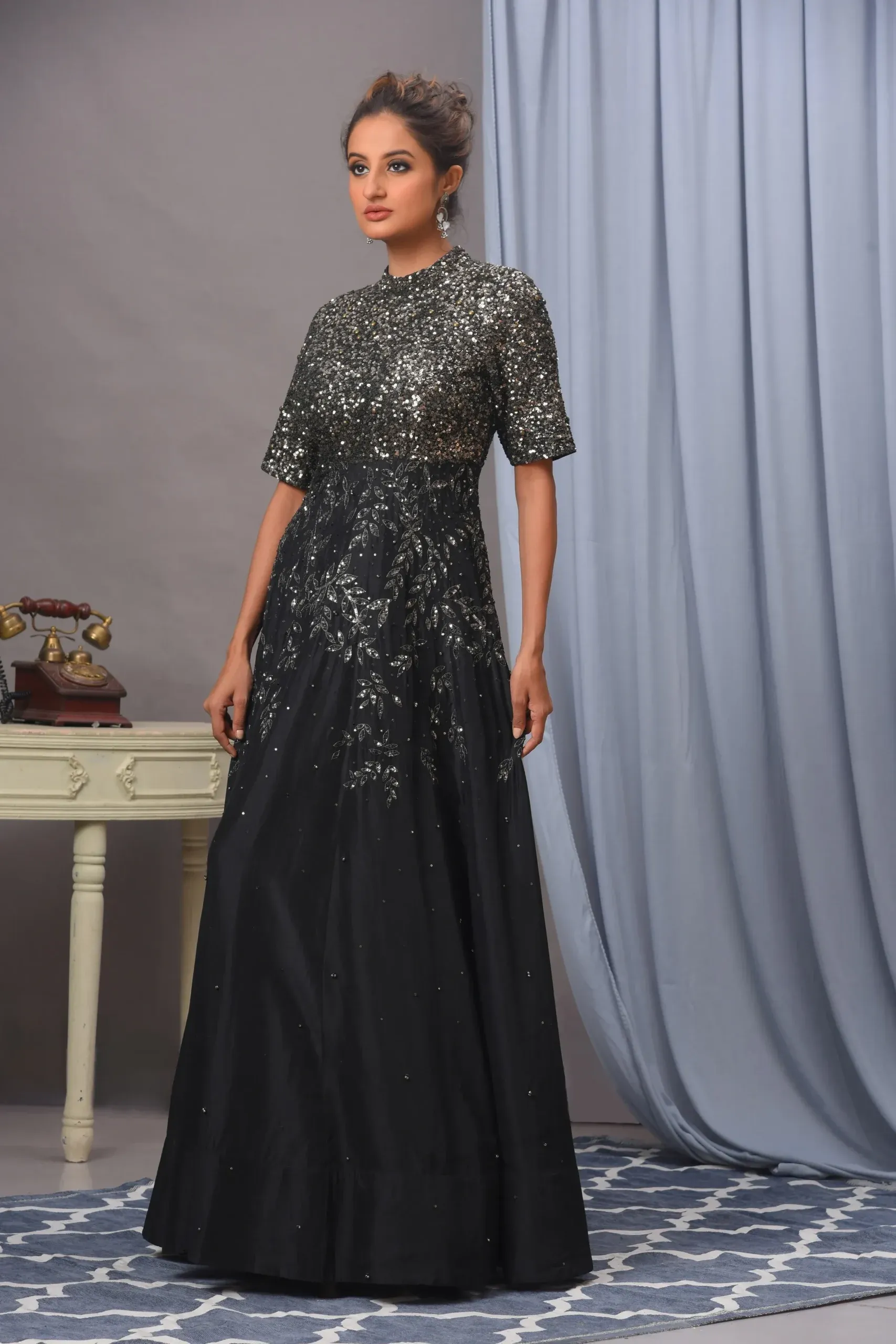 Vivek Kumar introduces a beautifully handcrafted black gown. Crafted from luxurious black crepe, the gown drapes beautifully, ensuring a flattering fit. The intricate embroidery and sequins work showcases fine craftsmanship, adding a touch of richness and visual interest. This gown is designed to make you shine at any event!