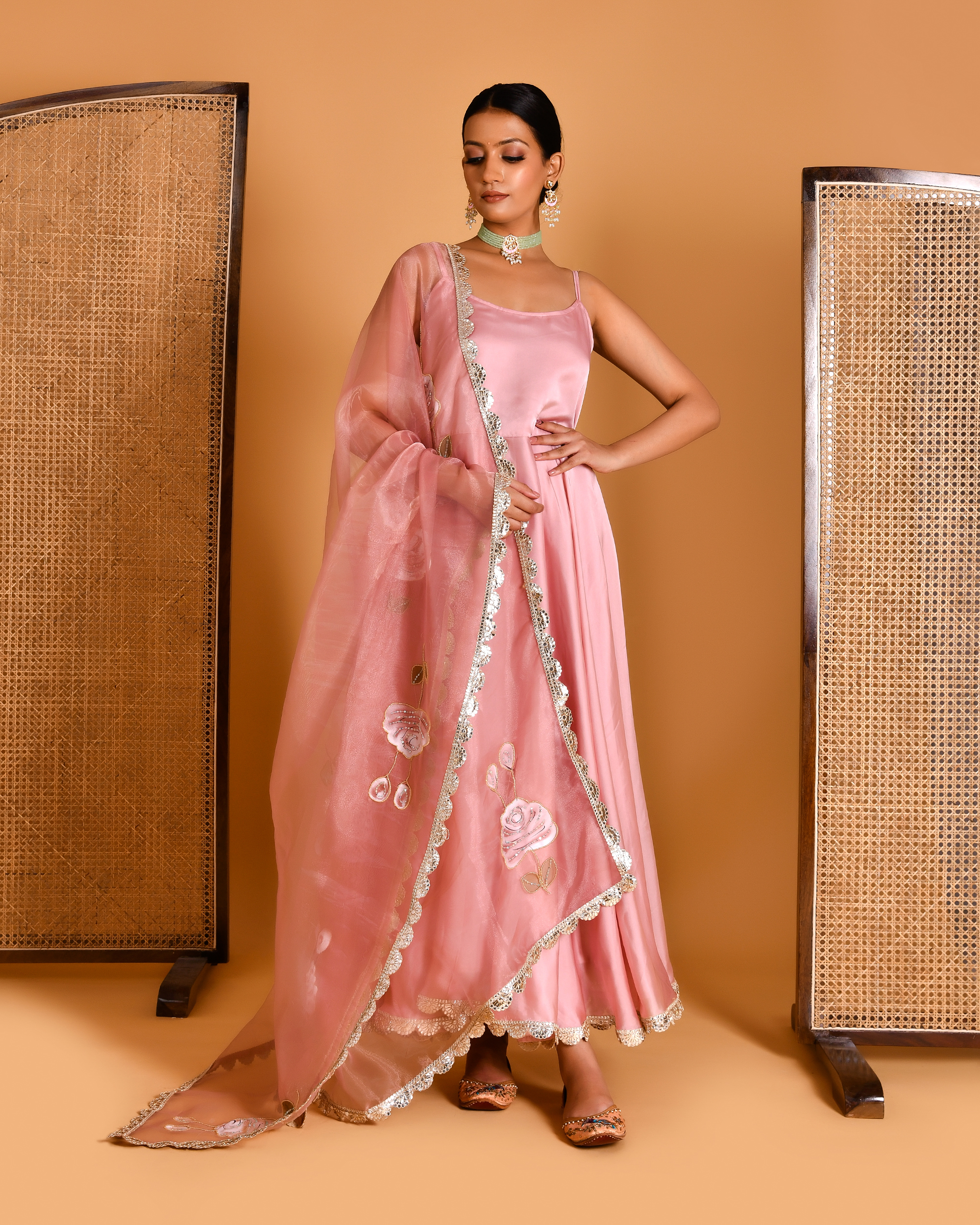 Pink Zari Embellished Floor-Length Anarkali Set