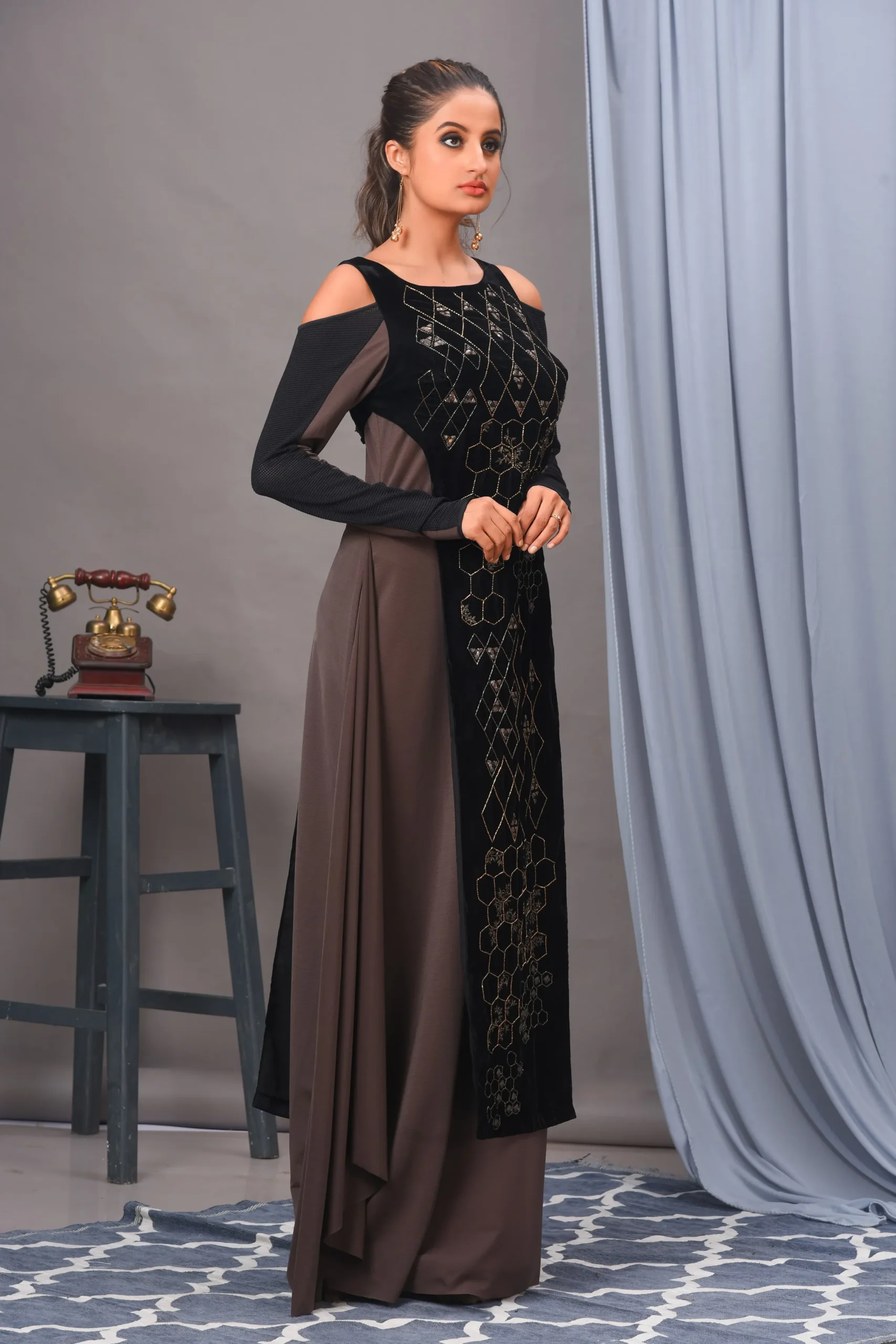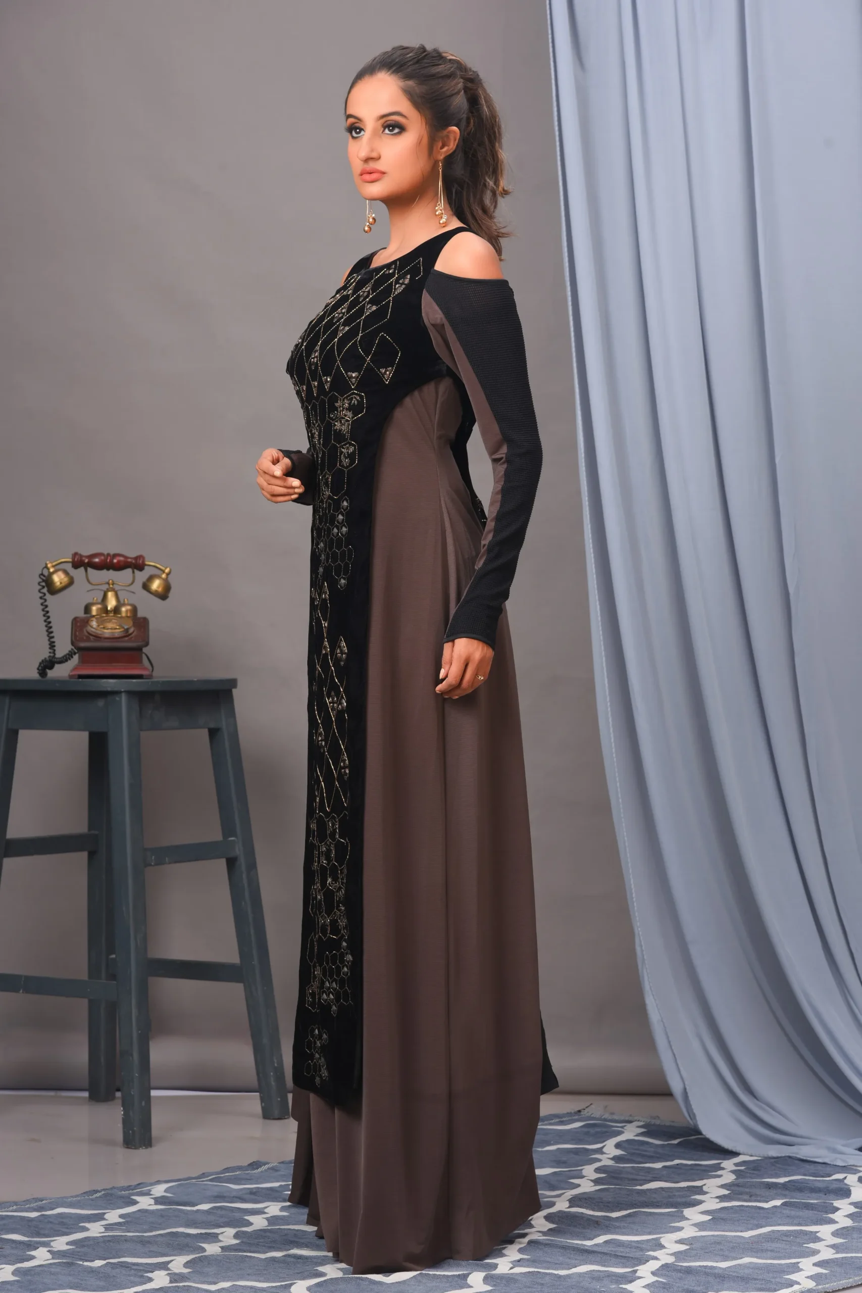 Presenting a stunning black and grey full cold-shoulder gown in velvet and spandex base, Crafted from a luxurious velvet and spandex blend, this dress offers a flattering fit and modern flair. The intricate antique gold hand embroidery on the front and back panels adds a touch of opulence, making it a true statement piece.