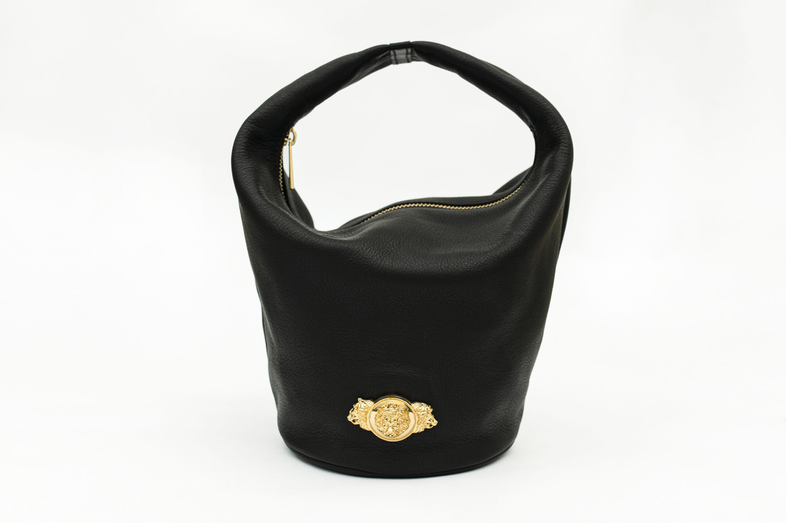 Experience vibrant design with this bag. A blend of superior materials and cutting-edge design, this is more than just an accessory. Experience striking elegance with this Black genuine leather bucket bag with a structured shape, lion motif carved embellishment, and drop handle. Perfect for those who dare to be different, this piece shines with creativity. It features metal embellishment, complemented by 24k gold-plated fittings. The bag is secured with a zip, making it glamorous.