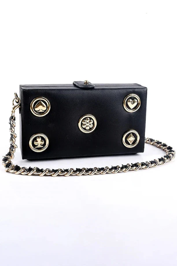 Experience opulent design with this bag. This bag is your passport to effortless style, designed for the discerning individual. Experience radiant elegance with this Black genuine leather clutch with a rectangle structured shape, textured pattern, placement floral, suit of cards motifs carved embellishment & attached wrist belt. A masterpiece of modern design, this accessory is sure to turn heads. It features metal embellishment, complemented by 24k gold plated fittings. The bag is secured with a zip.