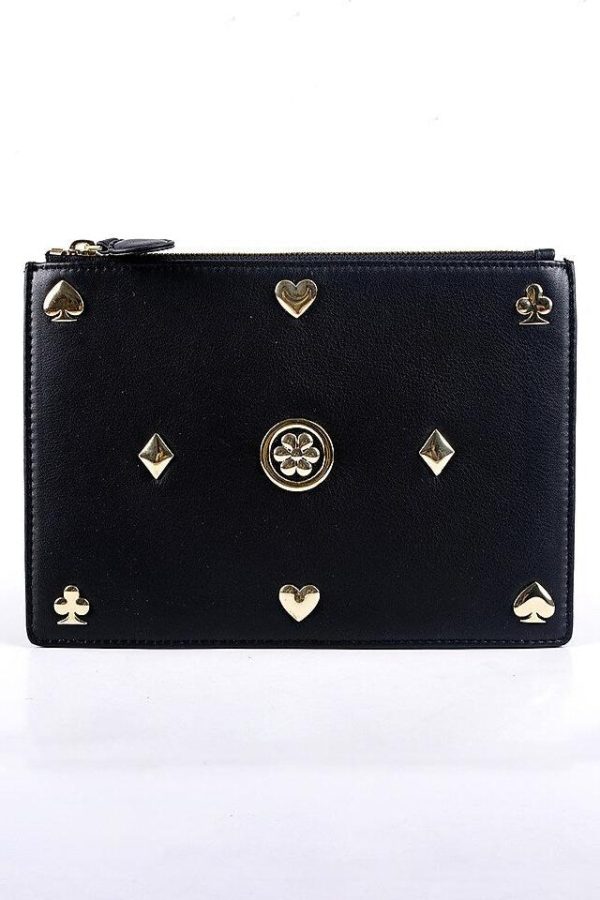 This chic bag redefines style. A must-have for fashion enthusiasts, it elevates any outfit with effortless charm. Experience striking elegance with this Rich black clutch bag in leather base with 24k gold plated flower, heart, club, diamond and spades embellishments. Perfect for those who dare to be different, this piece shines with creativity. Its features are embellished and complemented by standard fittings. The bag is secured with a zip.