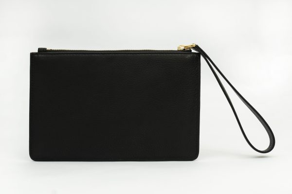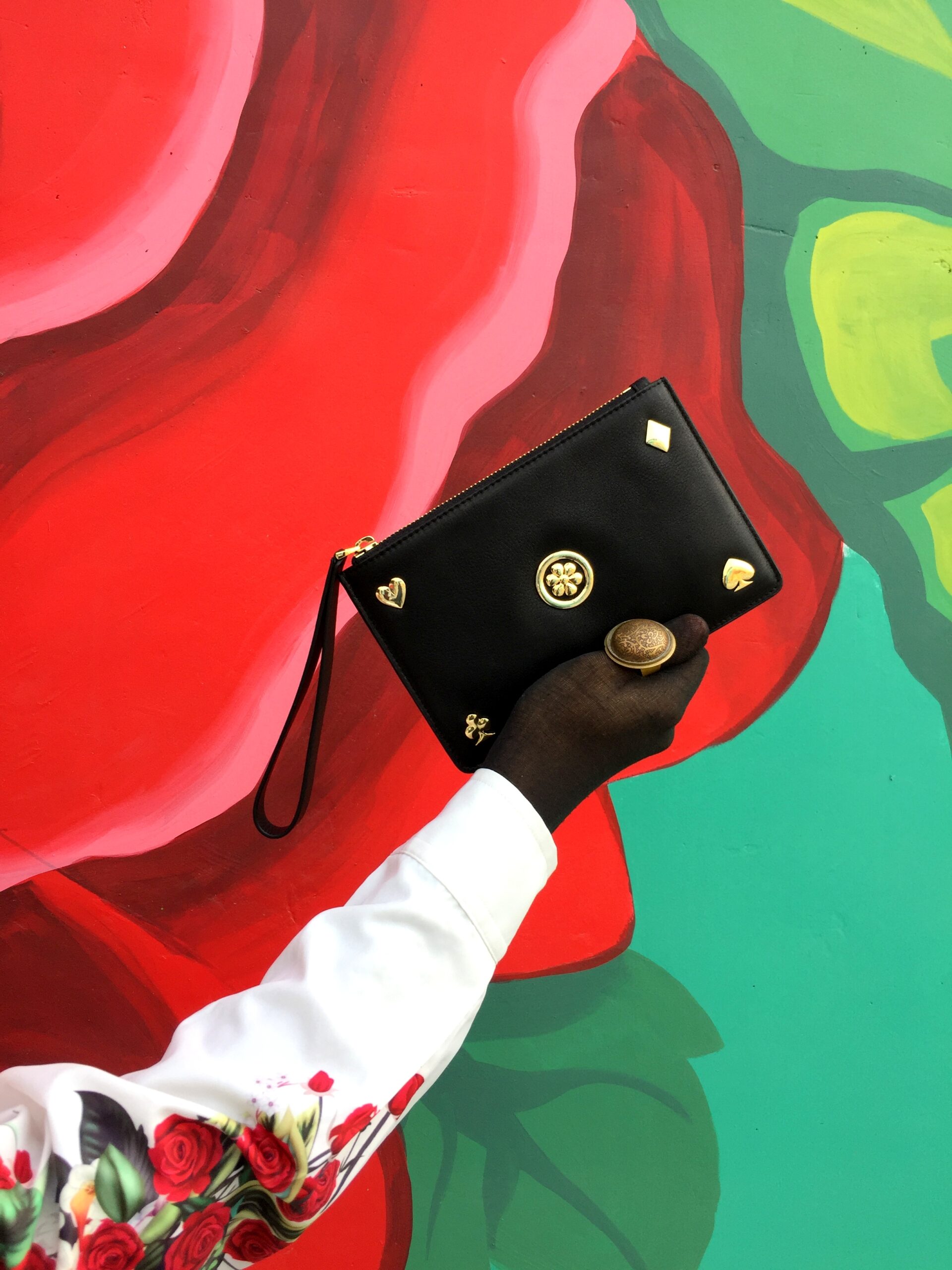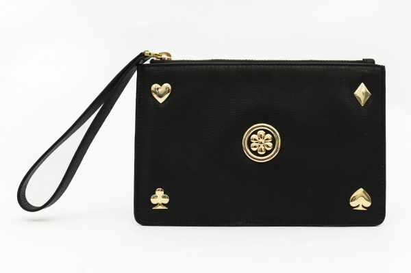 This stylish bag redefines style. Inspired by classic design, this accessory brings a sophisticated edge to your wardrobe. Experience bold elegance with this Black genuine leather handbag with a rectangle structured shape, textured pattern, placement floral, suit of cards motifs carved embellishment & attached wrist belt. It features metal embellishment, complemented by 24k gold plated fittings. The bag is secured with a zip. Unleash your confident style with this statement-making piece.