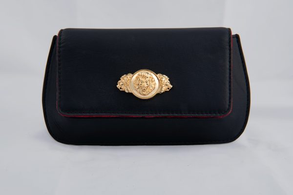 Experience vibrant design with this bag. A blend of superior materials and cutting-edge design, this is more than just an accessory. Experience striking elegance with this Black genuine leather clutch with a curved structured shape, envelope flap & placement lion motif carved detailing. Comes with a detachable sling chain. Perfect for those who dare to be different, this piece shines with creativity. It features metal embellishment, complemented by a metallic sling chain, and 24k gold plated fittings. The bag is secured with a magnet button.