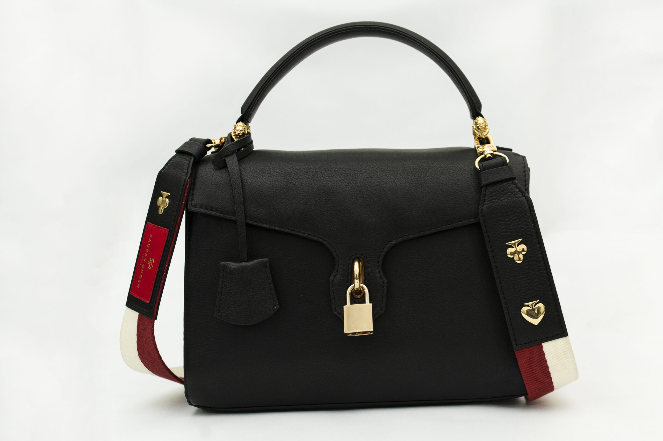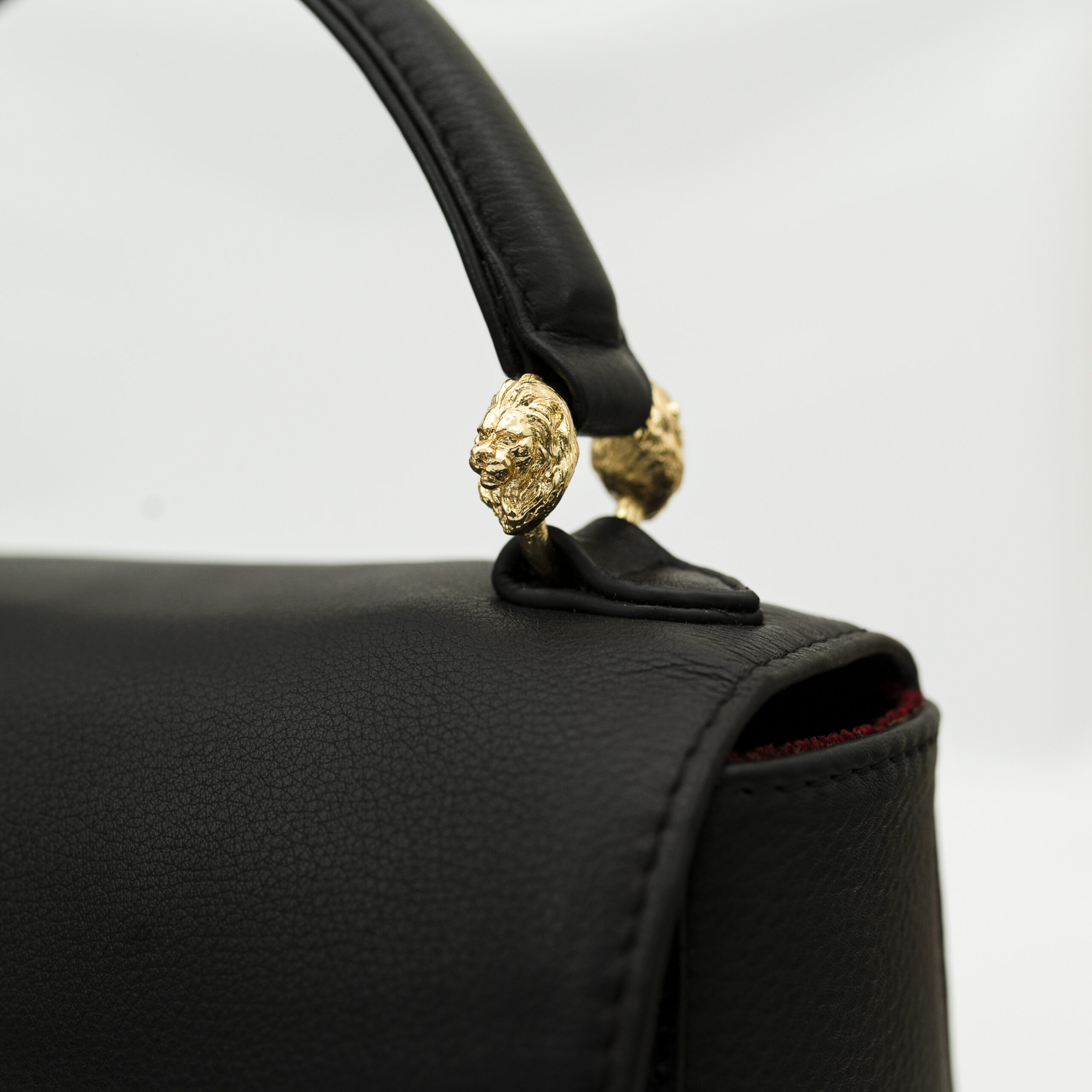 This luxurious bag redefines style. Crafted for the modern professional, this bag seamlessly blends functionality with timeless style. Experience radiant elegance with this Black genuine leather handbag with a rectangle structured shape, envelope flap, lion motif carved detailing & drop handle. A masterpiece of modern design, this accessory is sure to turn heads. It features carved fittings, complemented by 24k gold plated fittings. The bag is secured with a push lock. Note- The webbing strap is not the part of this bag its for styling.