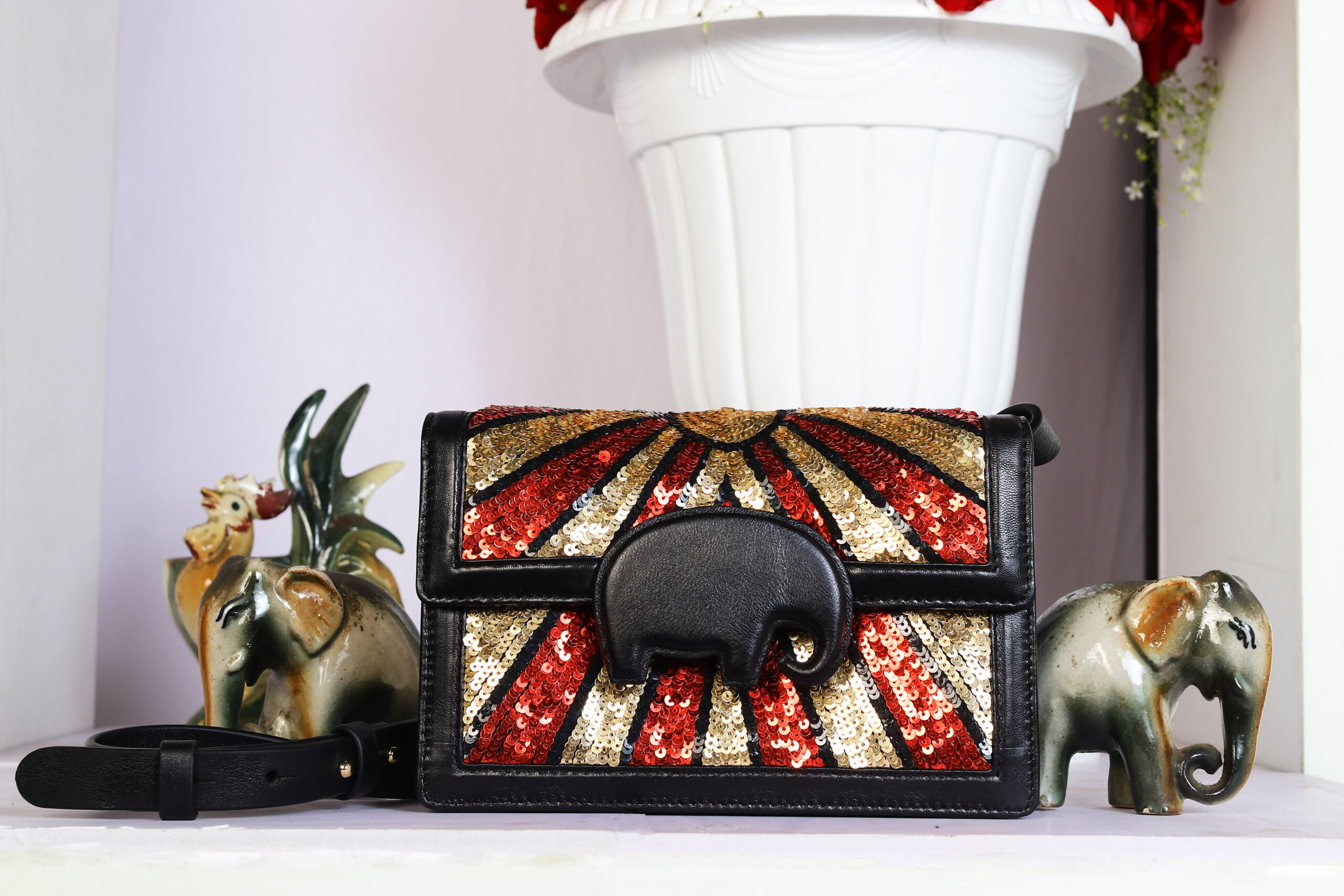 This chic bag redefines style. A must-have for fashion enthusiasts, it elevates any outfit with effortless charm. Experience striking elegance with this Black genuine leather hand bag with rectangle structured shaped, envelope flap, mammoth cut work motif, gold & red stripe pattern sequin embellishment. Comes with a detachable leather strap. Perfect for those who dare to be different, this piece shines with creativity. It features sequin embellishment, complemented by 24k gold plated fittings. The bag is secured with a magnet button. making it both stylish.