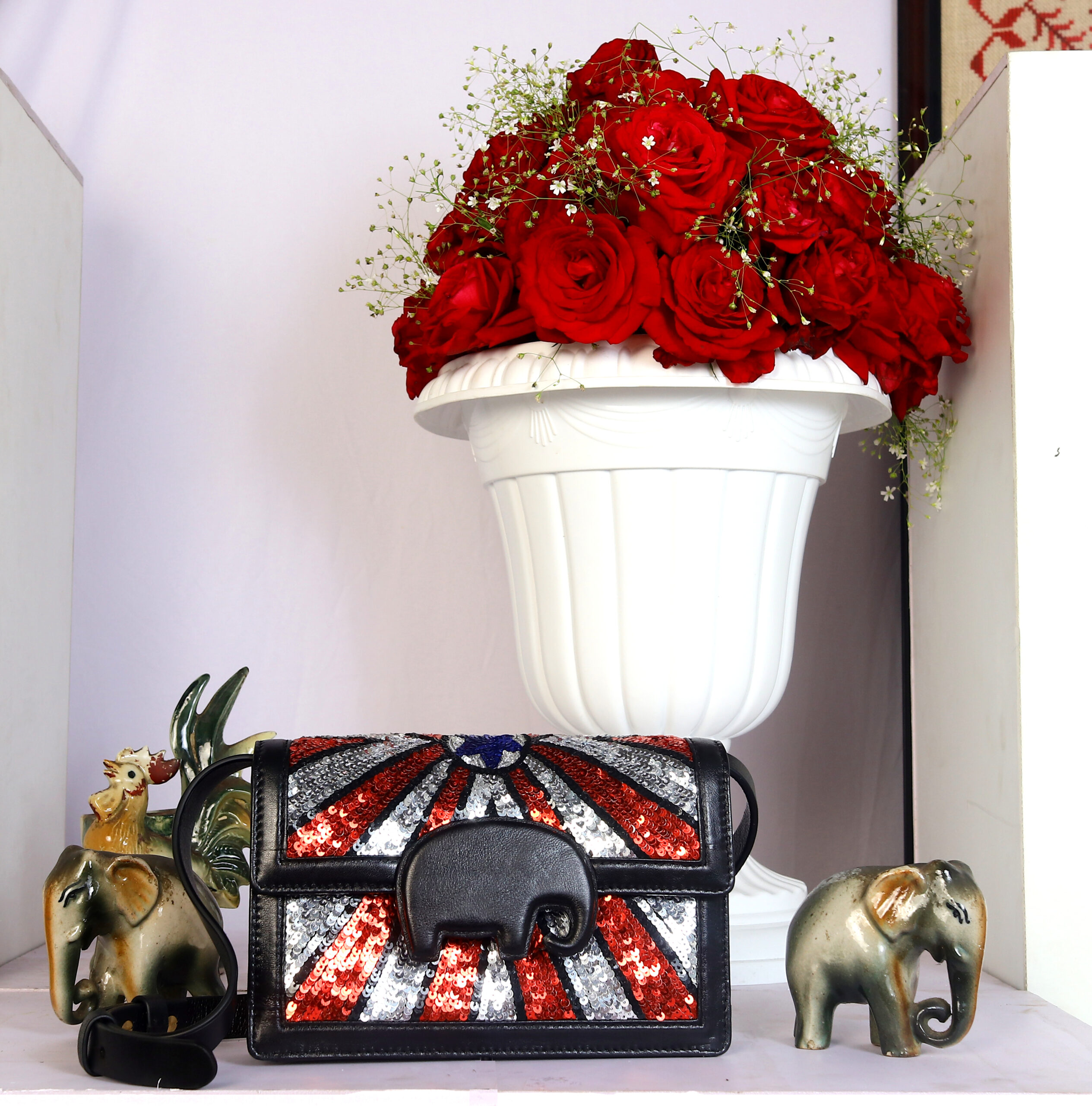 This premium bag redefines style. Designed for everyday excellence, this bag is a testament to superior craftsmanship. Experience dazzling elegance with this Black genuine leather handbag with a rectangle structured shaped, envelope flap, mammoth cut work motif, and gold & red stripe pattern sequin embellishment. Comes with a detachable leather strap. With a dazzling appearance, this bag effortlessly enhances any look. It features sequin embellishment, complemented by 24k gold plated fittings. The bag is secured with a magnet button. making it both fashionable.