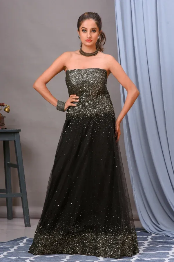Featuring this stunning black net off shoulder gown that beautifully blends tradition and craftmanship with contemporary elegance. Embroidered with intricate patterns and shimmering embellishments that adds a dazzling touch to any occasion.