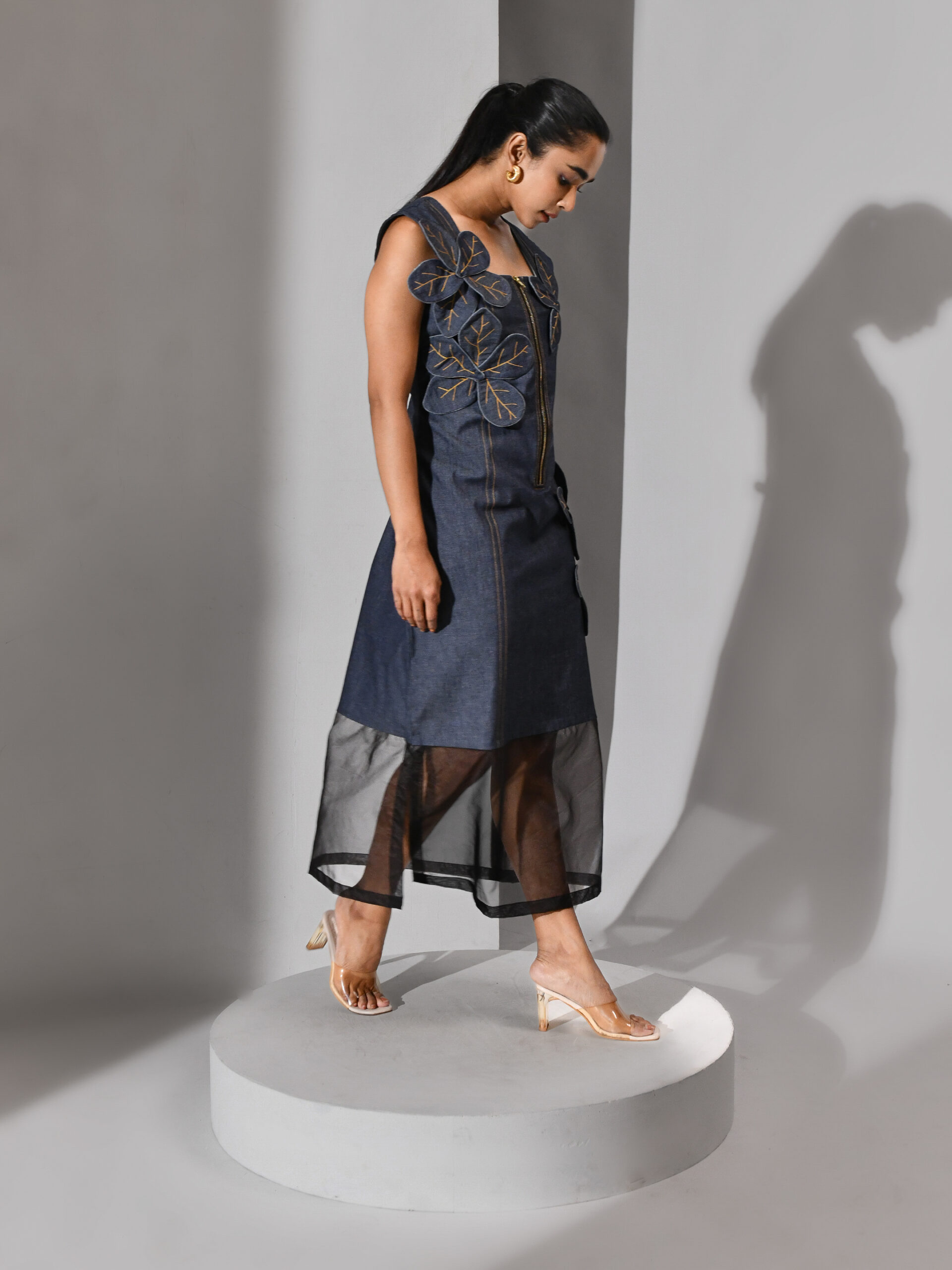 Introducing our blue denim dress with tonal appliqué flower — a bloom carved from its own terrain. This dress features a flower appliqué in the same denim fabric, creating subtle texture and a quiet statement. The silhouette is grounded and structured, while the sheer organza bottom panel adds a delicate, airy touch, balancing architectural lines with softness. This dress merges organic inspiration with contemporary design.