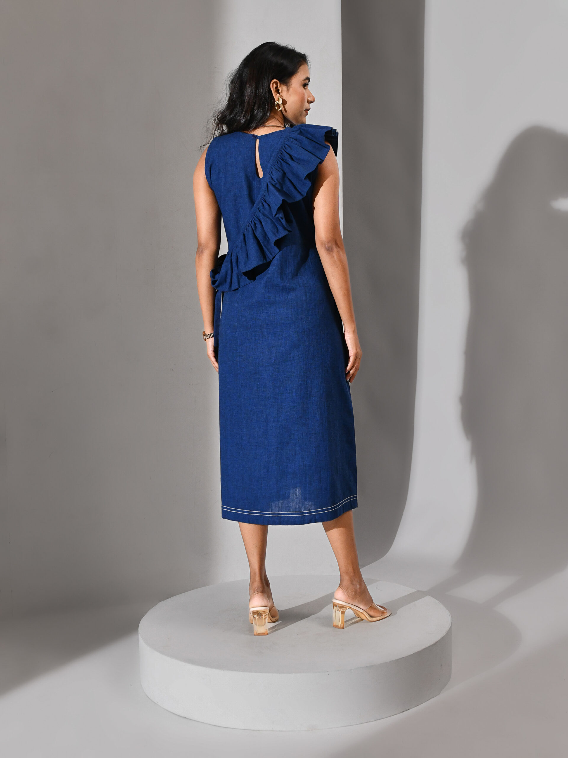 Introducing our blue dress—a balance of sculptural grace and fluid adaptability. The dress features a modular gathered sash that can be worn or removed, offering versatility and personal expression. Its silhouette is intentional, with clean lines softened by movement, creating elegance that is both structured and effortless.