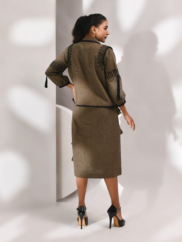 Introducing our brown dress with jacket — a rhythm etched in contrast. This dress features circular cuts and linear black detailing that loop across warm brown tones, creating a tactile and intentional silhouette. Each design element is crafted with care, balancing control and release, softness and graphic clarity. Paired with a complementary jacket, this set is perfect for women seeking contemporary elegance with a touch of modern artistry.
