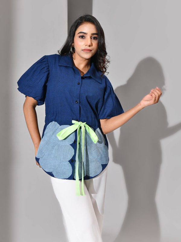 Deep Blue Patch Work Shirt With Balloon Sleeves