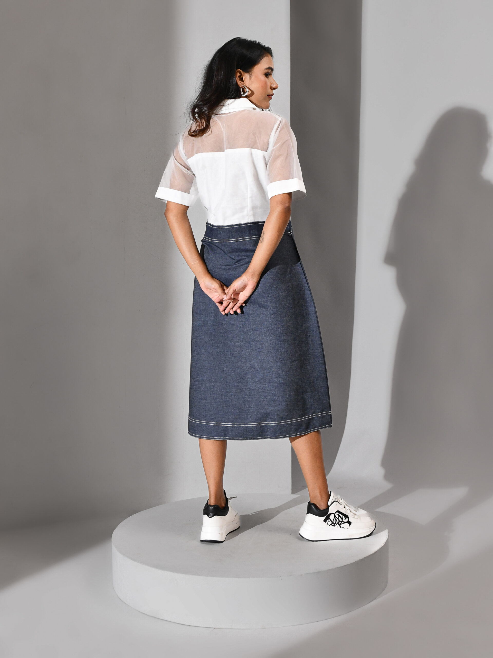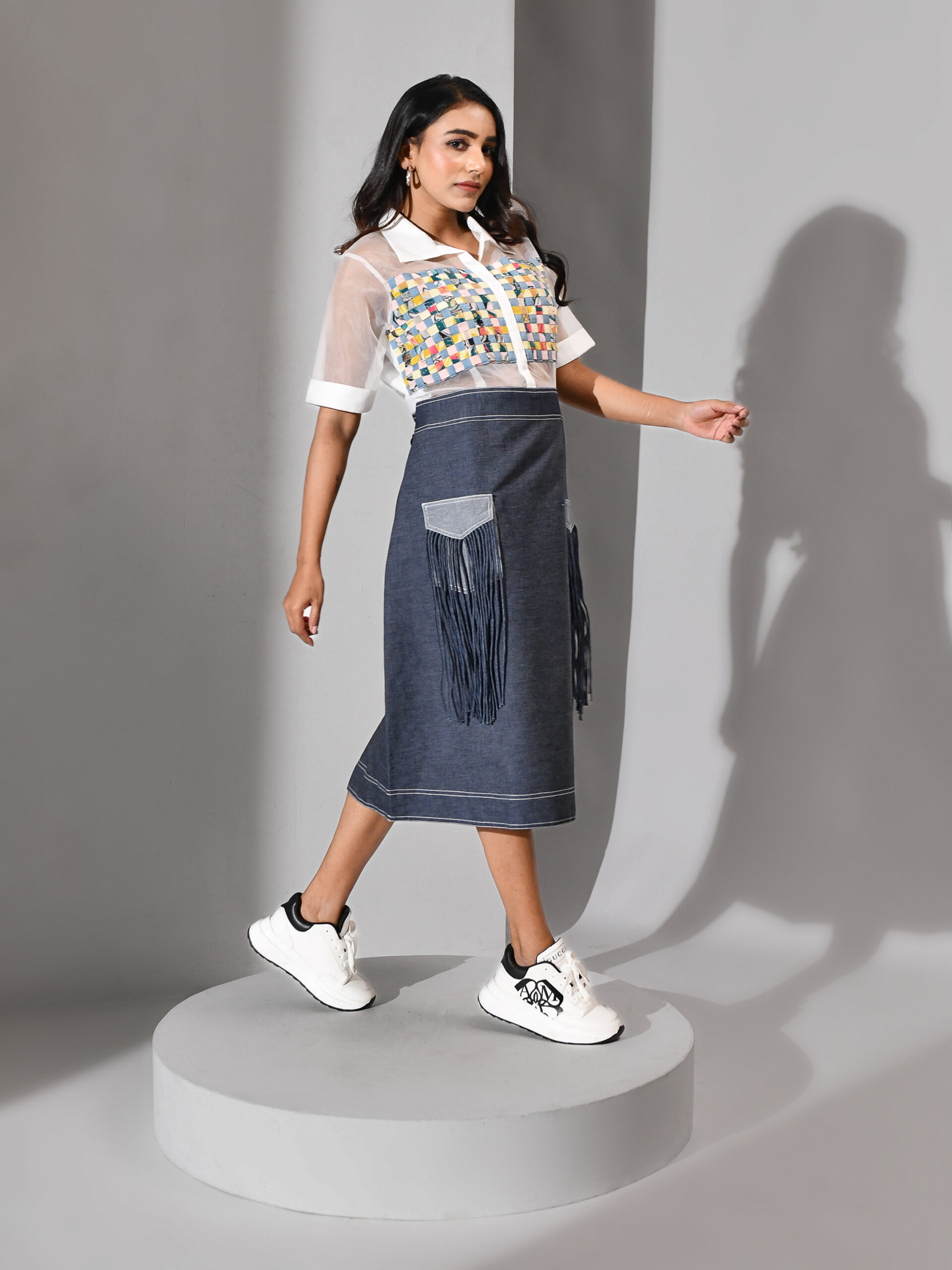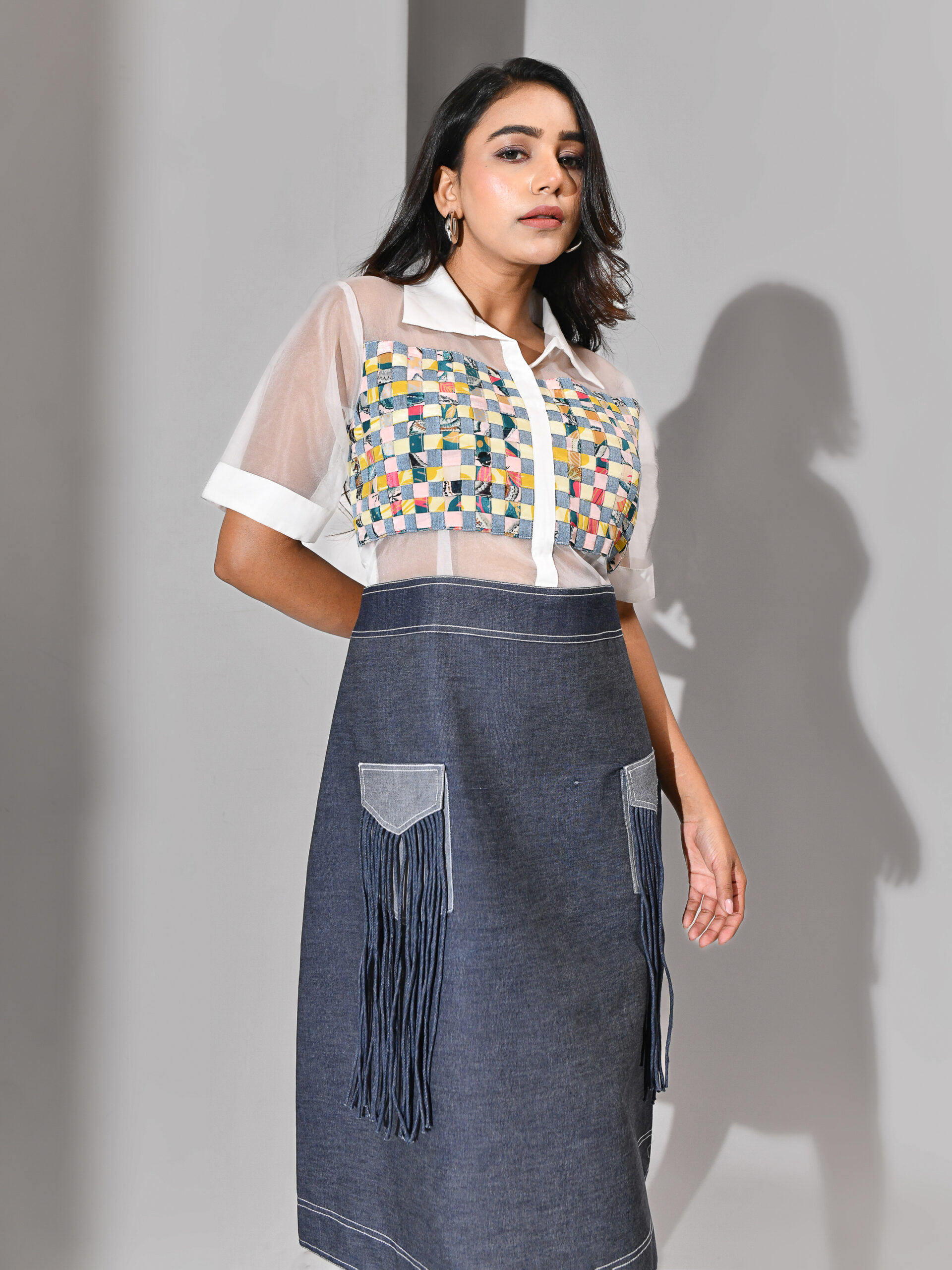 Introducing our denim and organza panel dress — a modern fusion of structure and softness. The upper bodice features a sheer white organza base adorned with multicolored woven interlacement, adding a playful yet artistic touch. The denim skirt contrasts beautifully with its grounded texture, enhanced by front patch pockets and fringe detailing that bring in movement and edge. Designed in a clean, structured silhouette, this dress balances craftsmanship and creativity.