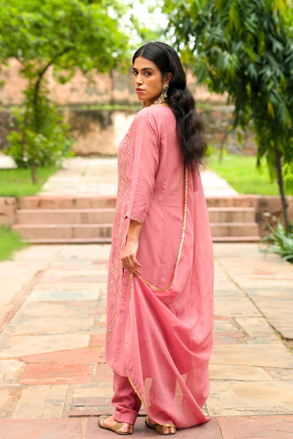 Elevate this dusky rose ensemble with statement gold jewelry—think chandelier earrings or a delicate layered necklace to accentuate its refined embroidery. Pair it with nude or blush-toned heels for a graceful finish, and carry a sleek clutch in metallic gold or ivory.