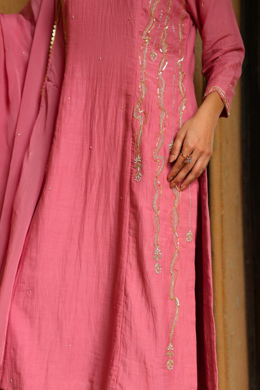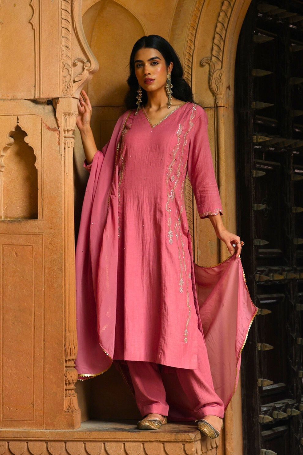 Introducing our dusky rose three-piece ensemble, a poetic blend of sophistication and subtle charm. Crafted in a soft, romantic hue, the long V-neck kurta features delicate gold floral embroidery that captures the essence of refined femininity. Paired with straight-cut pants and a beautifully bordered dupatta, this set is perfect for elegant daytime affairs or evening celebrations.