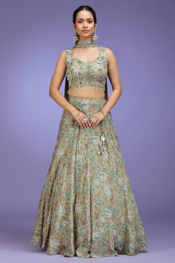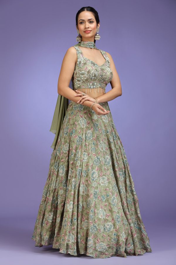 Introducing our floral printed sage green viscose embroidered lehenga set, beautifully crafted with a modern silhouette and intricate floral artistry. The ensemble features a sleeveless sage green viscose blouse showcasing an all-over floral print, enriched with shimmering sequins, fine threadwork, and elegant beaded fringe detailing. It is paired with a gracefully flared floral printed viscose lehenga, adorned with sequins embroidery that create a soft yet captivating visual appeal. A matching dupatta completes the look, styled effortlessly around the neckline for a chic and contemporary finish. Perfect for sangeet nights, daytime weddings, festive gatherings, and occasions where soft luxury and modern elegance come together seamlessly.