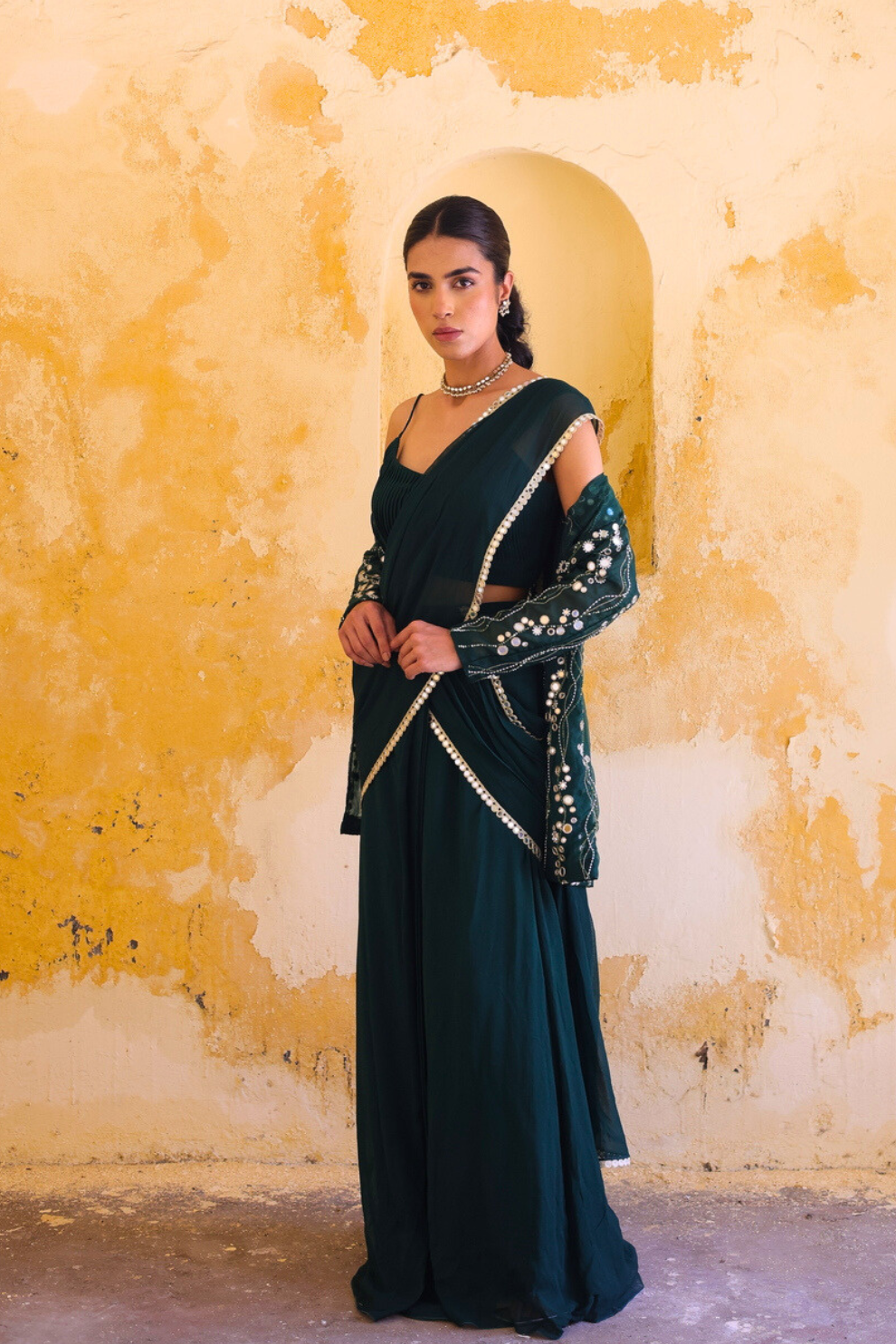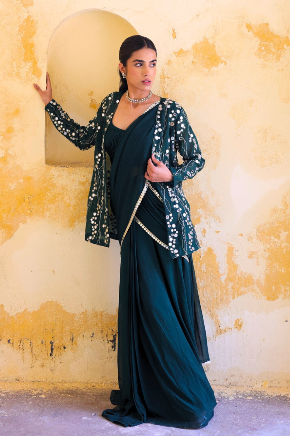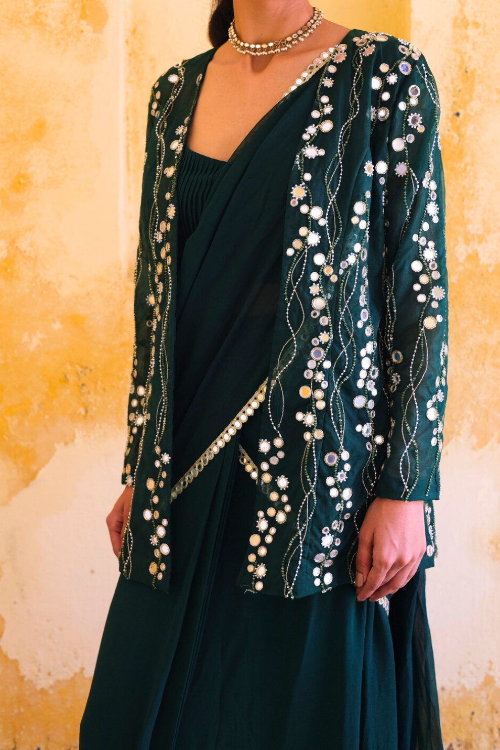 Introducing forest green sari ensemble, a perfect fusion of modern sophistication and enduring appeal. The sari features a sleek, minimal drape with a subtle sheen, radiating understated elegance. Paired with a statement jacket embellished with all-over intricate silver sequin and bead embroidery, it exudes contemporary opulence. Finished with a delicate beaded waist chain, this ensemble is designed for those who appreciate refined glamour perfect for evening soirees and elegant celebrations.