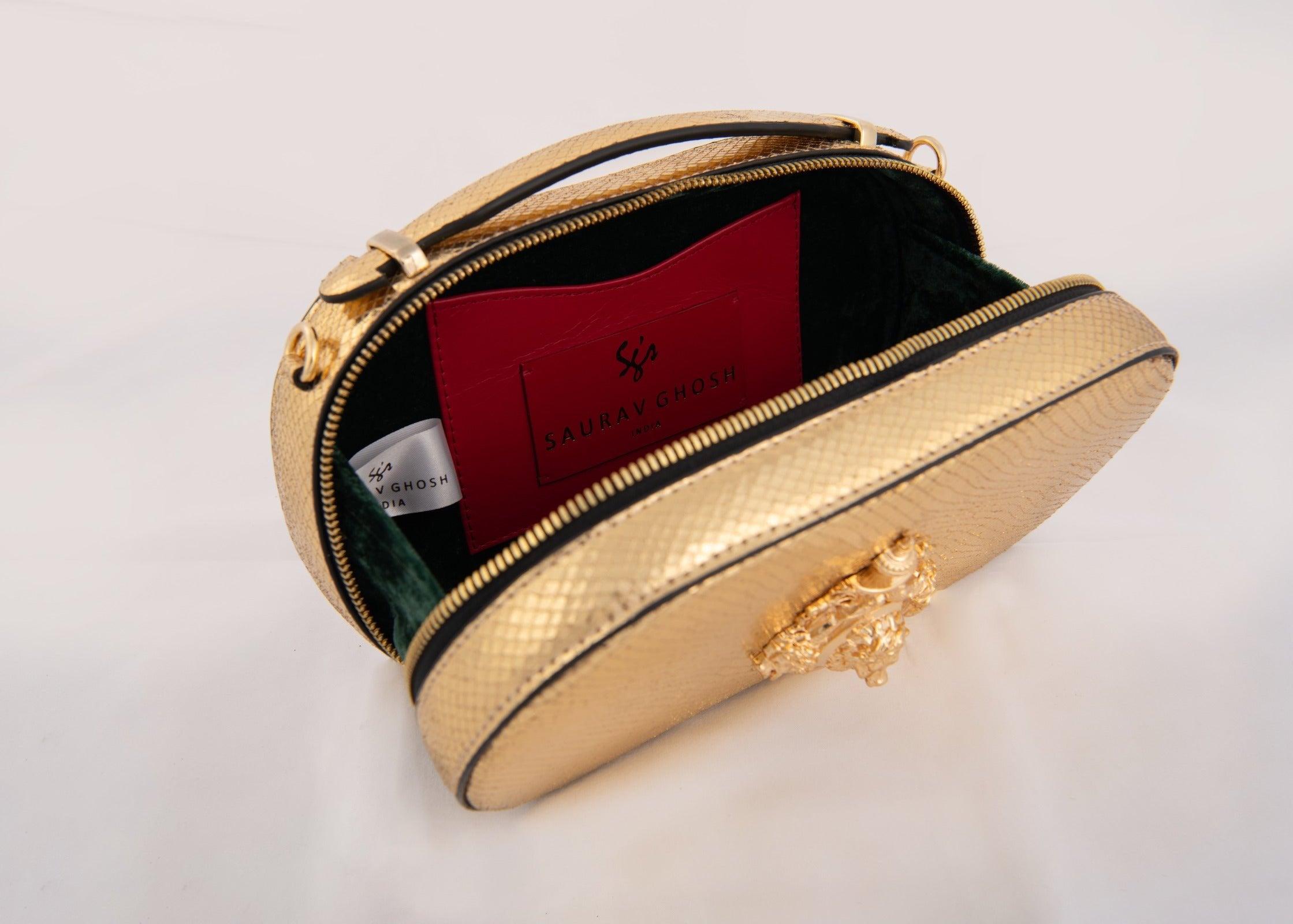 Experience trendy design with this Gold genuine leather clutch. With its graceful contours, it tells a story of impeccable taste and individuality. Experience alluring elegance with this Ashoka textured clutch with a textured pattern & animal, floral carved brooch in the center. Comes with a detachable sling. A fusion of fashion and functionality, it complements your vibrant lifestyle. It features metal embellishment, complemented by standard fittings. The bag is secured with a zip. making it both stylish and practical.
