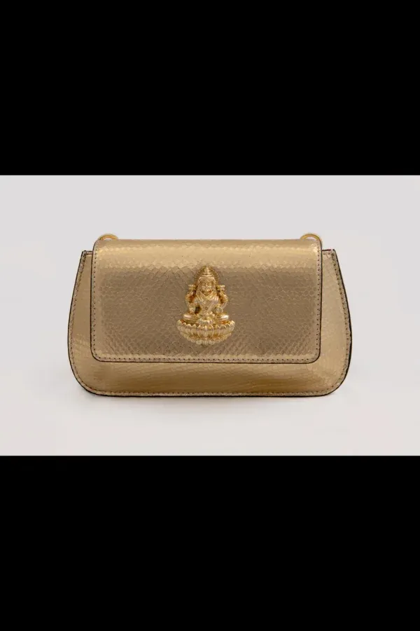 This sophisticated bag redefines style. Tailored for versatility, this piece is your ideal companion for work and leisure. Experience alluring elegance with this gold-plated rectangle-shaped clutch with a textured pattern & Goddess Laxmi carved brooch in the center. Comes with a detachable sling. A fusion of fashion and functionality, it complements your vibrant lifestyle. It features metal embellished, complemented by standard fittings. The bag is secured with a magnet button.