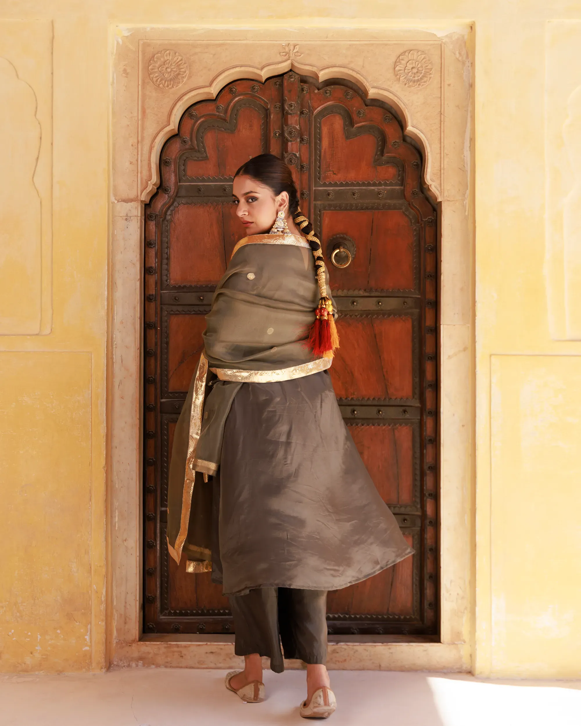 Style with antique gold or temple jewellery to complement the richness of the green hue. Pair with embroidered juttis or classic heels to complete the look with refined elegance.