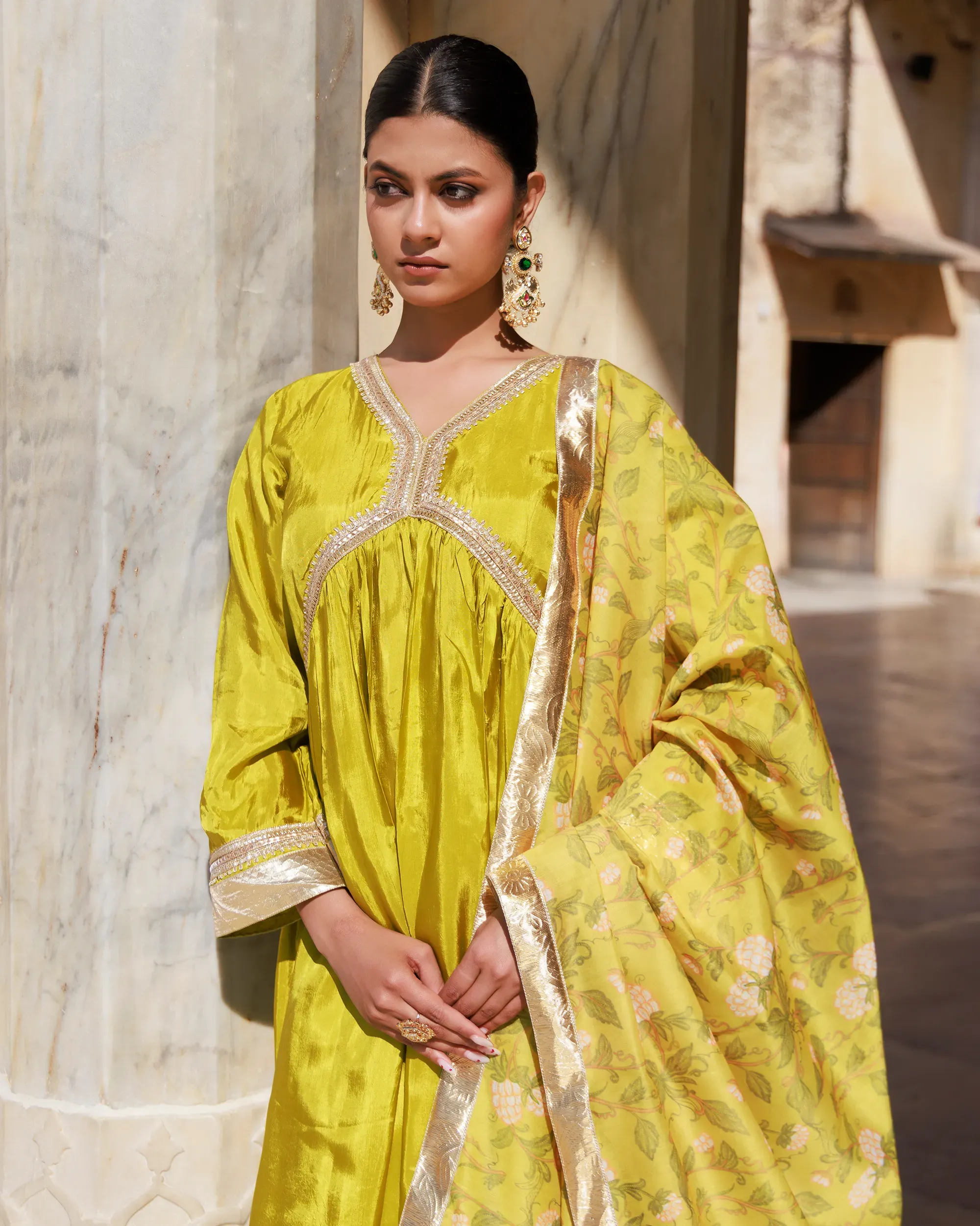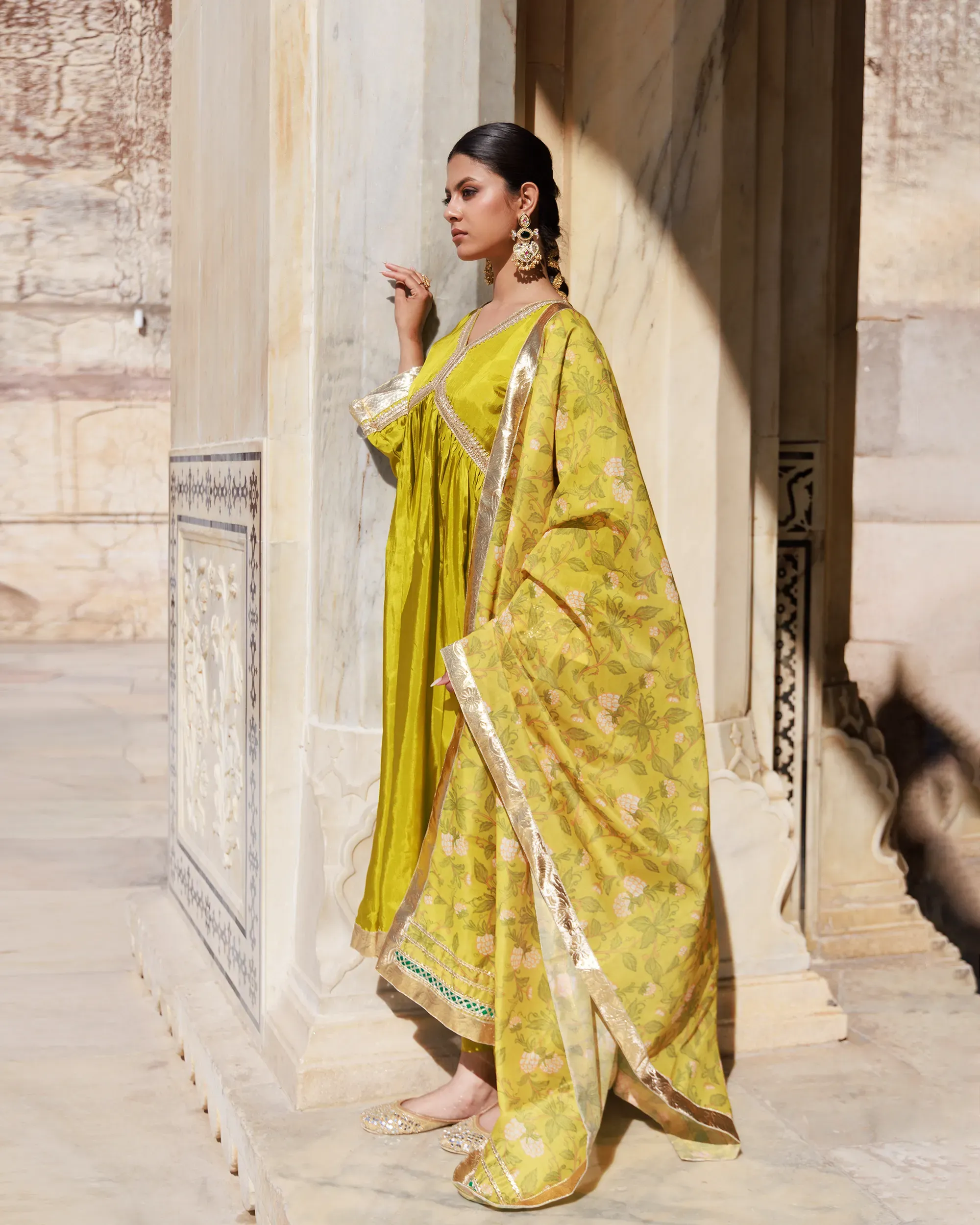 Pair with antique gold or kundan jewellery to enhance the richness of the silk. Style with embroidered juttis or classic mojaris and opt for soft glam makeup with highlighted eyes.