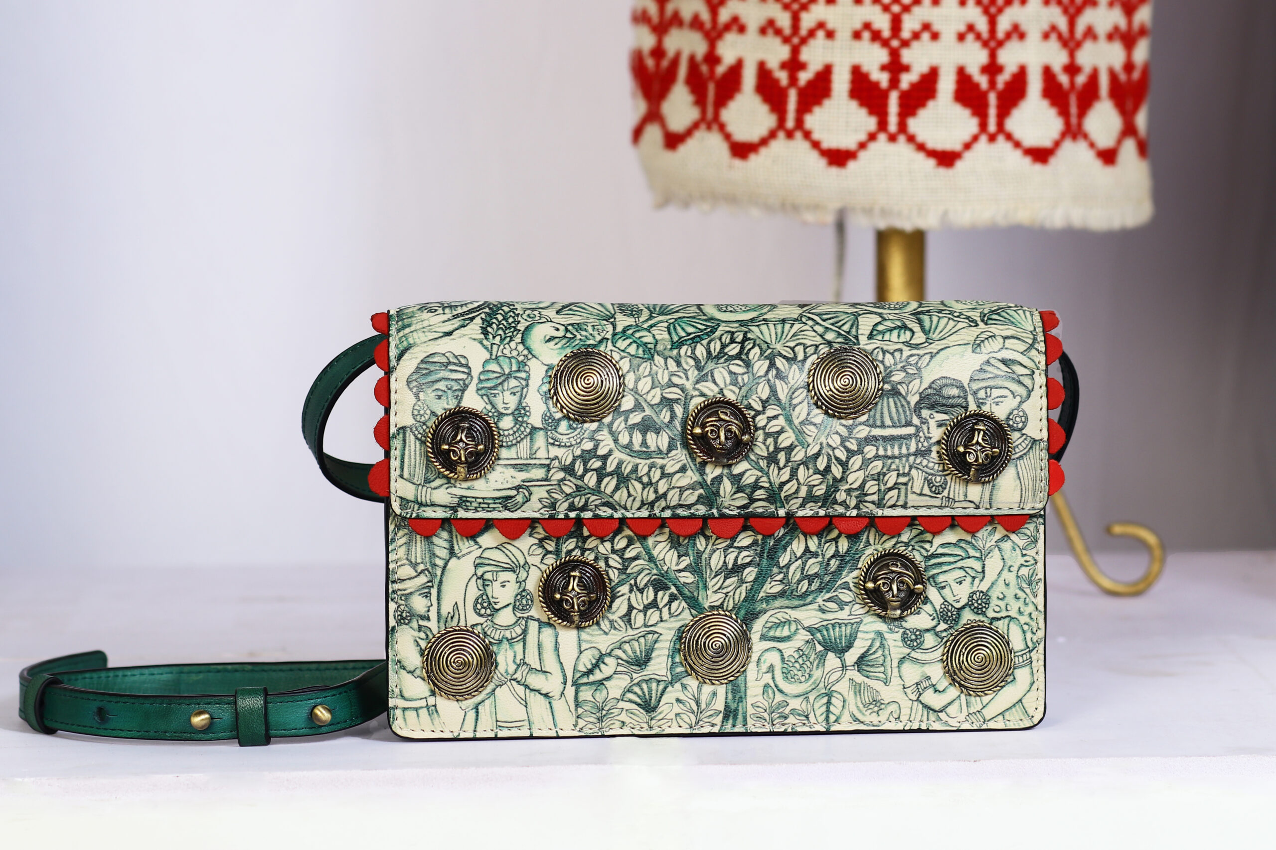 Experience opulent design with this bag. This bag is your passport to effortless style, designed for the discerning individual. Experience radiant elegance with this Beige & earthy green genuine leather bag with rectangle structured shape, all over medieval pattern hand painting, swirl & tribal carved pattern metal embellishment. Comes with detachable leather. A masterpiece of modern design, this accessory is sure to turn heads. It features hand-painted & metal embellishment, complemented by antique brass & silver embellishment. The bag is secured with a magnet button.