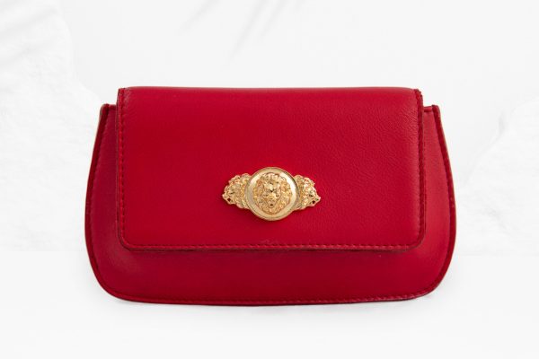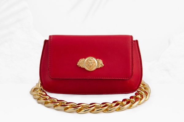 Experience exclusive design with this bag. Ideal for making a bold statement, this bag combines artistry with modern elegance. Experience dazzling elegance with this Haute red genuine leather clutch with a curved structured shape, envelope flap & placement lion motif carved detailing. Comes with a detachable sling chain. With a dazzling appearance, this bag effortlessly enhances any look. It features metal embellishment, complemented by a metallic sling chain, and 24k gold plated fittings. The bag is secured with a magnet button.