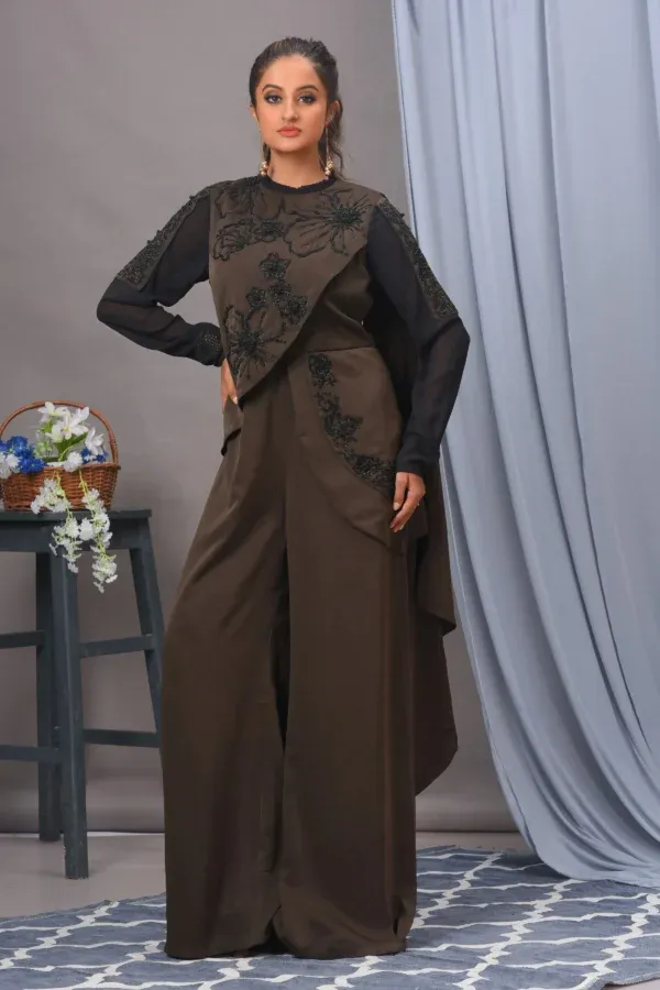 Vivek Kumar presents this stunning Indo-fusion jumpsuit which deserves a prime position in your wardrobe. Adorned with intricate cutdana and chic work, it showcases exquisite craftsmanship and artistry. The elegant shoulder drape detailing adds a sophisticated touch, enhancing the overall aesthetic.