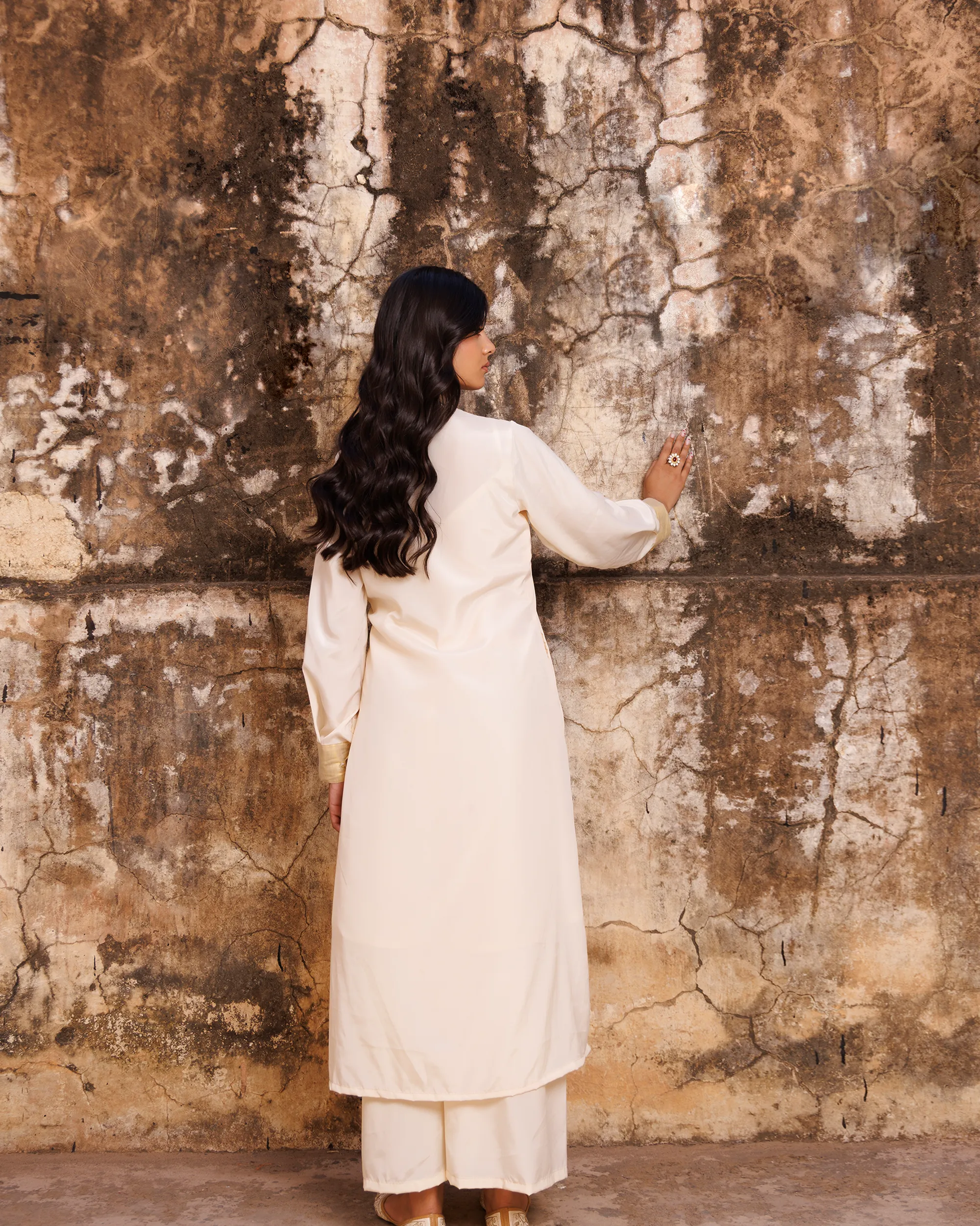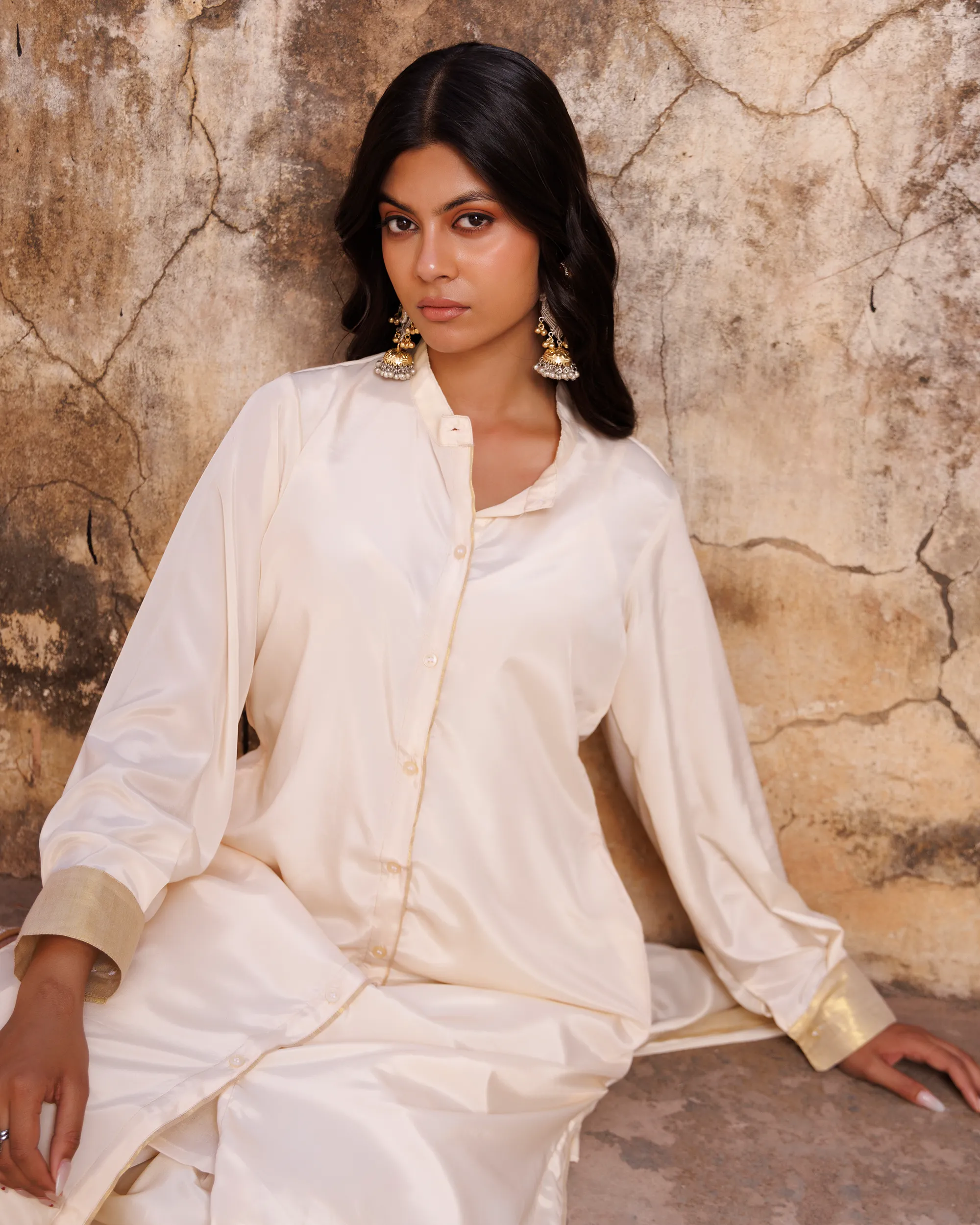 Style with pearl studs or gold-toned statement earrings for a refined finish. Pair with embroidered juttis or nude flats for effortless elegance. Wear the shirt fully buttoned for a polished look or slightly open at the collar for relaxed sophistication.