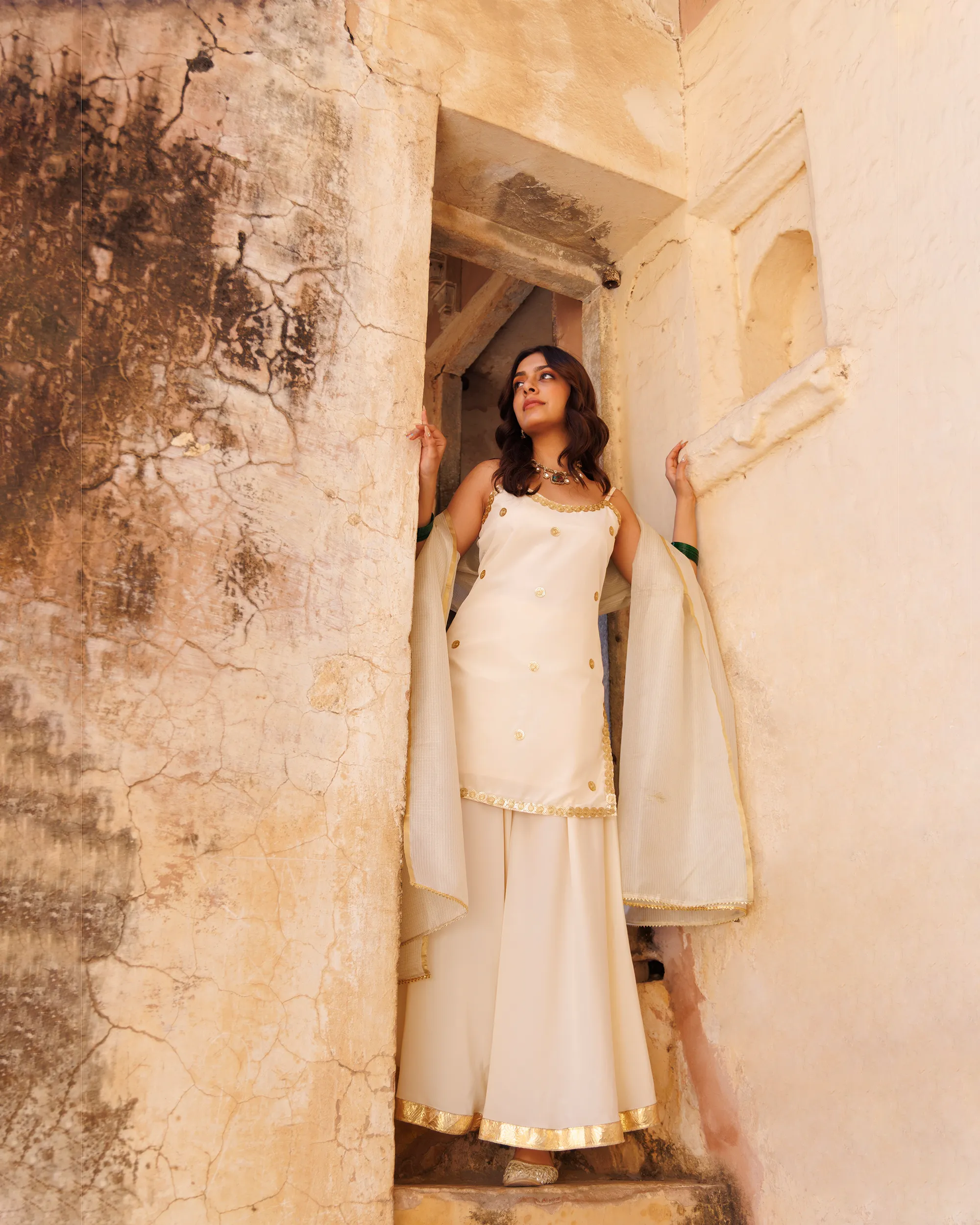 Ivory Crepe Strappy Kurta Sharara Set with Zari Doriya Dupatta
