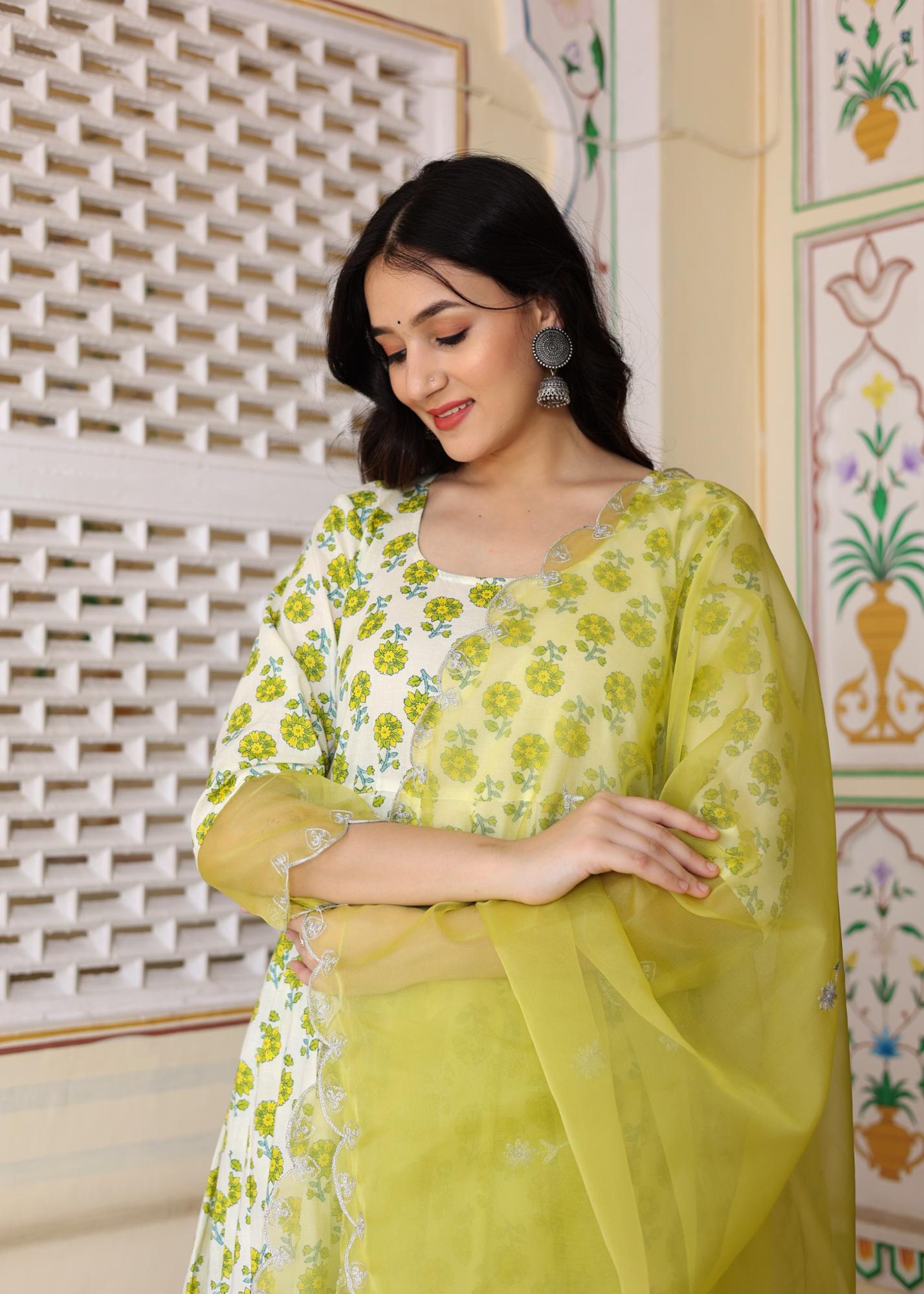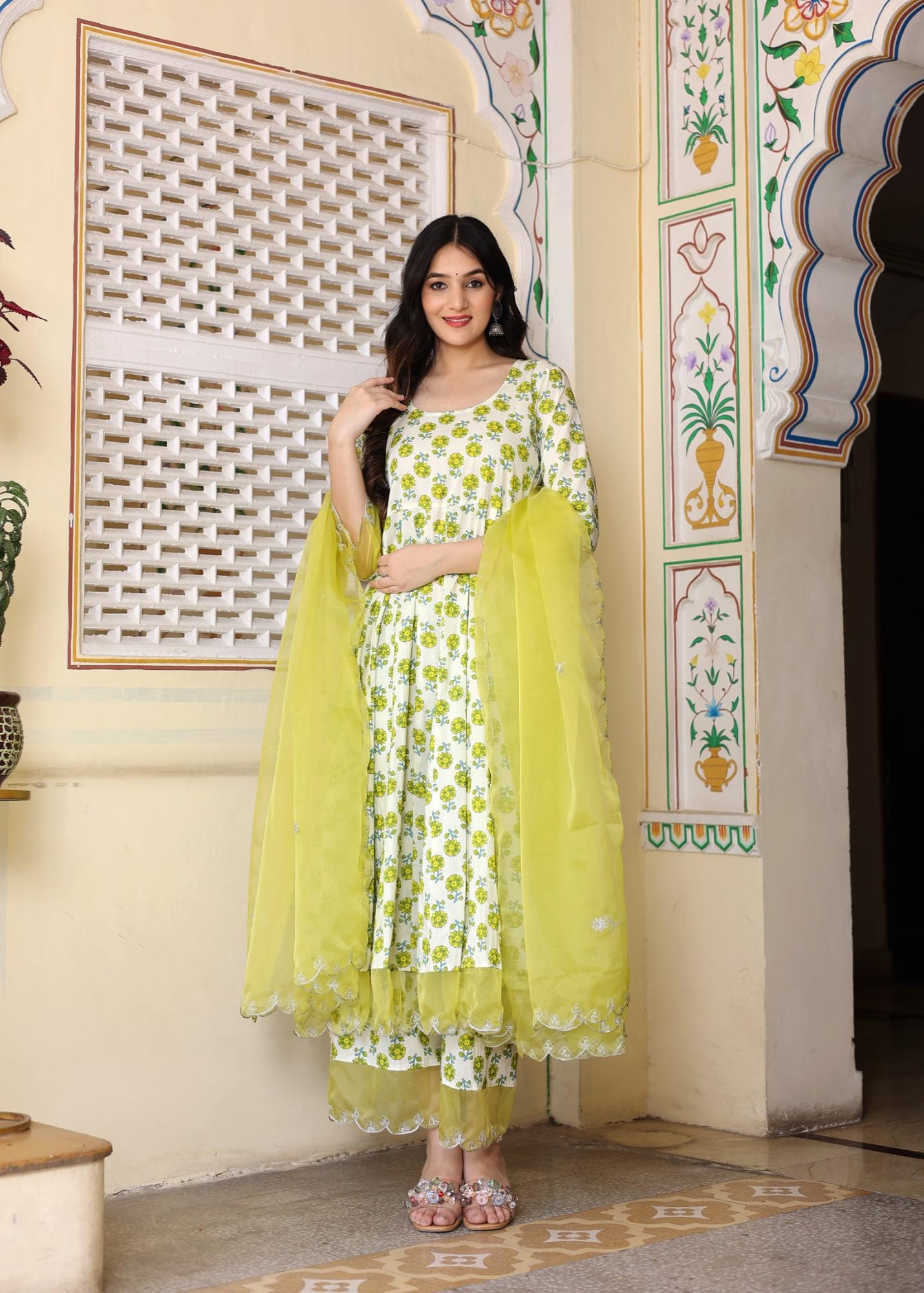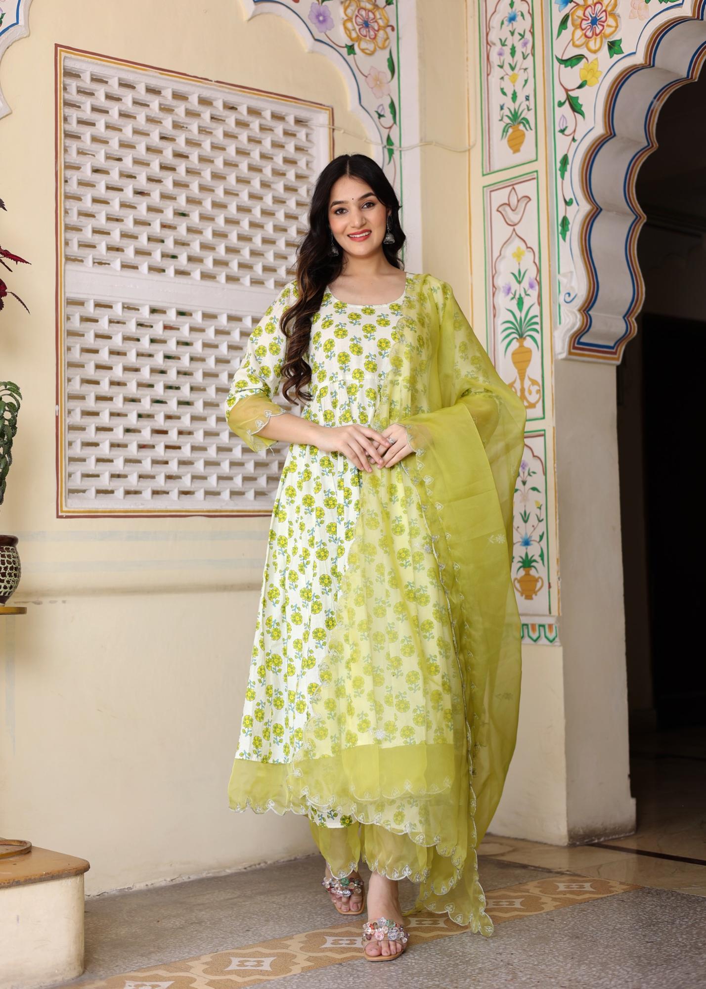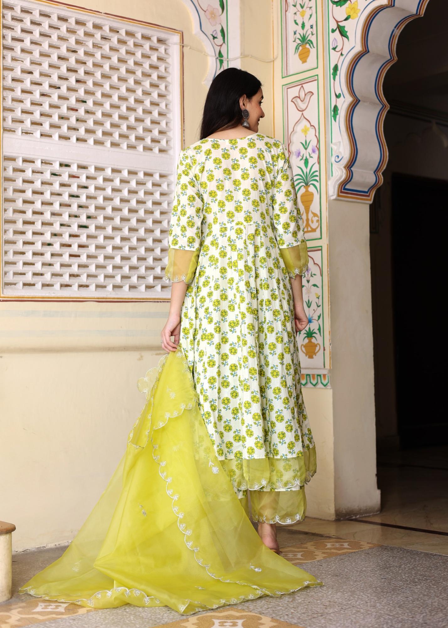 Ivory Hand Block Printed Anarkali Set with Soft Lemon Yellow Embroidery