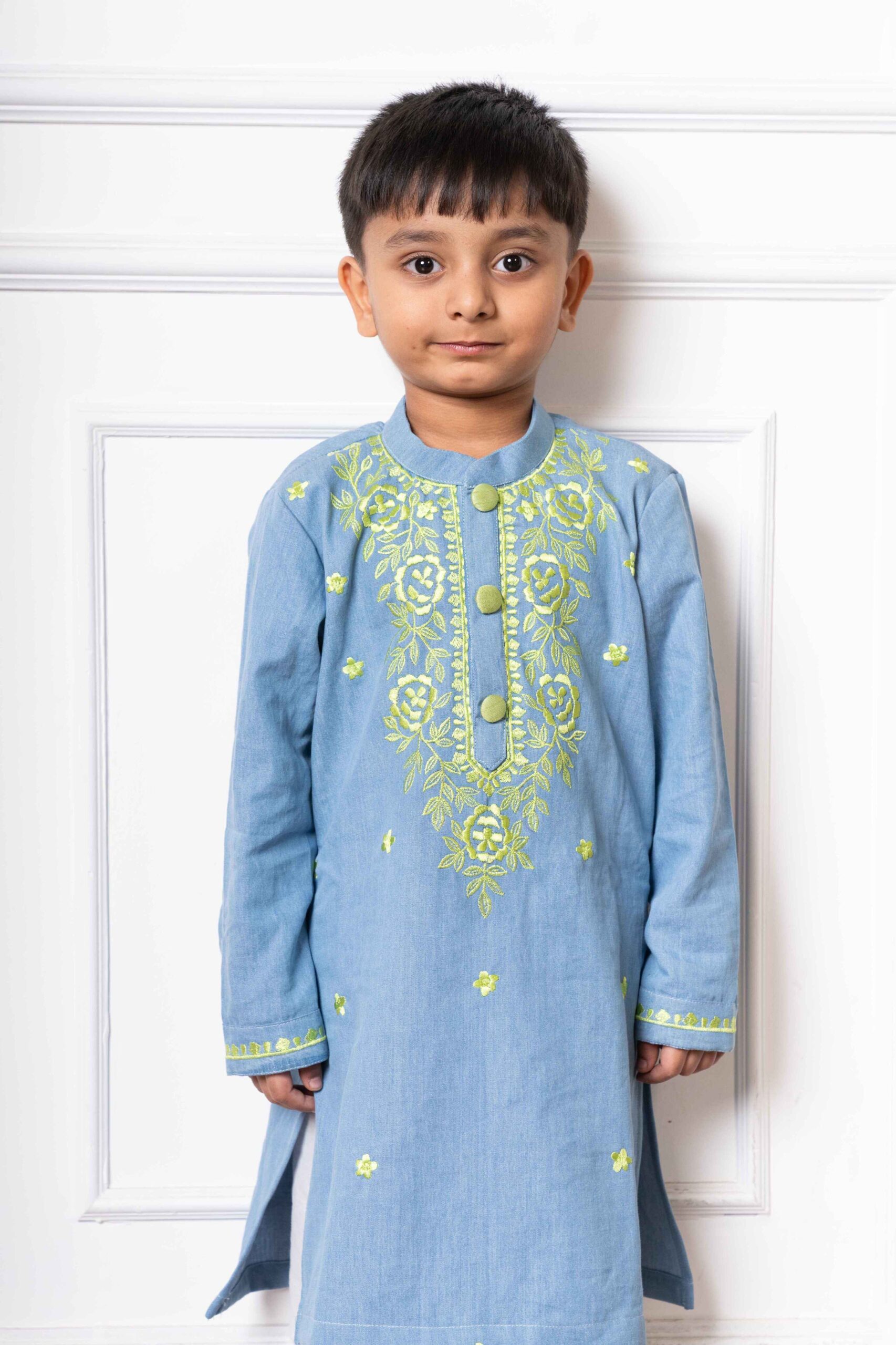 Elevate your ethnic wardrobe with this stunning soft denim kurta in a refreshing light blue shade, combining modern style with traditional charm. The kurta features intricate lime green floral embroidery around the neckline, chest, and cuffs, adding a vibrant yet elegant touch. A mandarin collar with decorative fabric buttons on the front placket enhances the festive appeal. Subtle embroidered floral motifs scatter across the fabric, offering delicate detailing. Pair it with the soft, lightweight white straight-cut pants, providing a minimalist yet stylish contrast. The breathable fabric ensures all-day comfort, perfect for long celebrations, events, or casual gatherings.