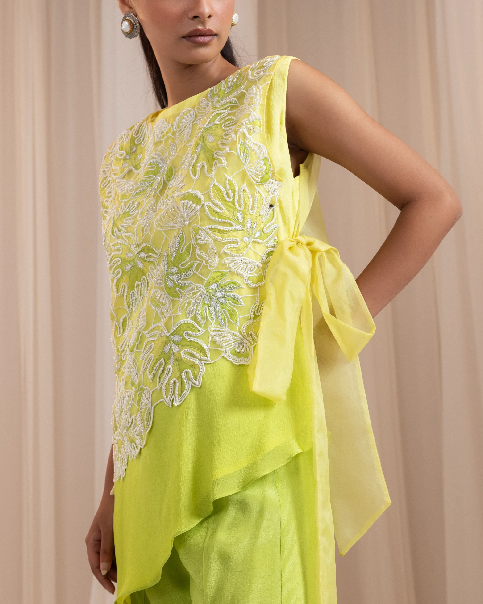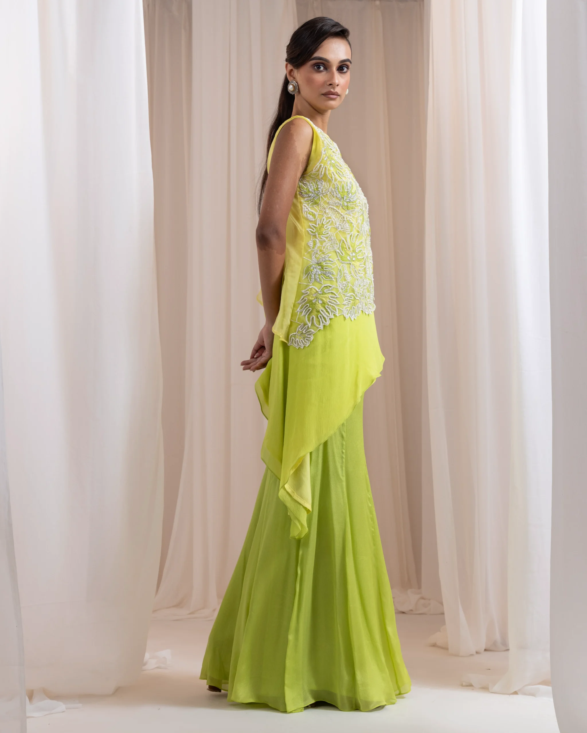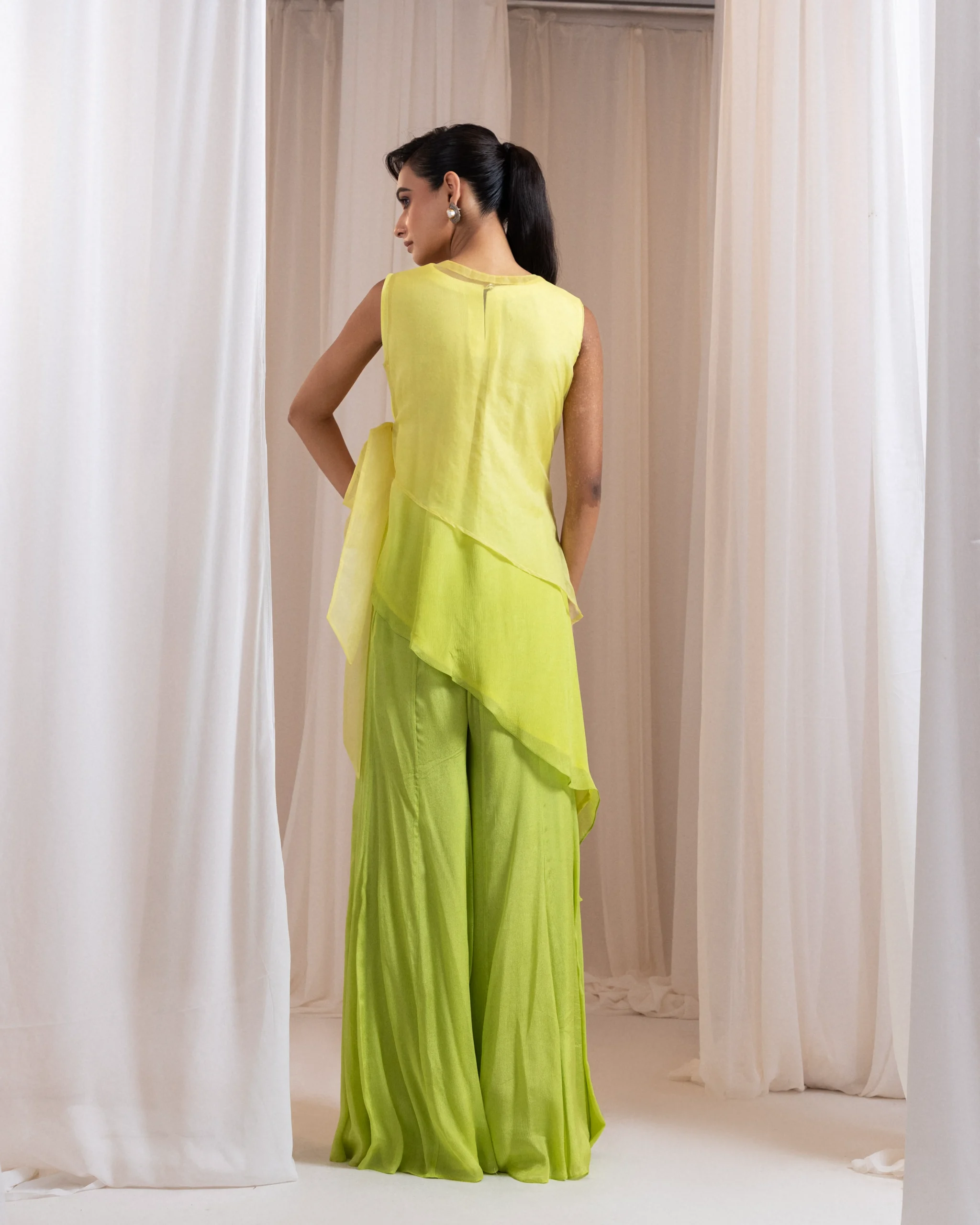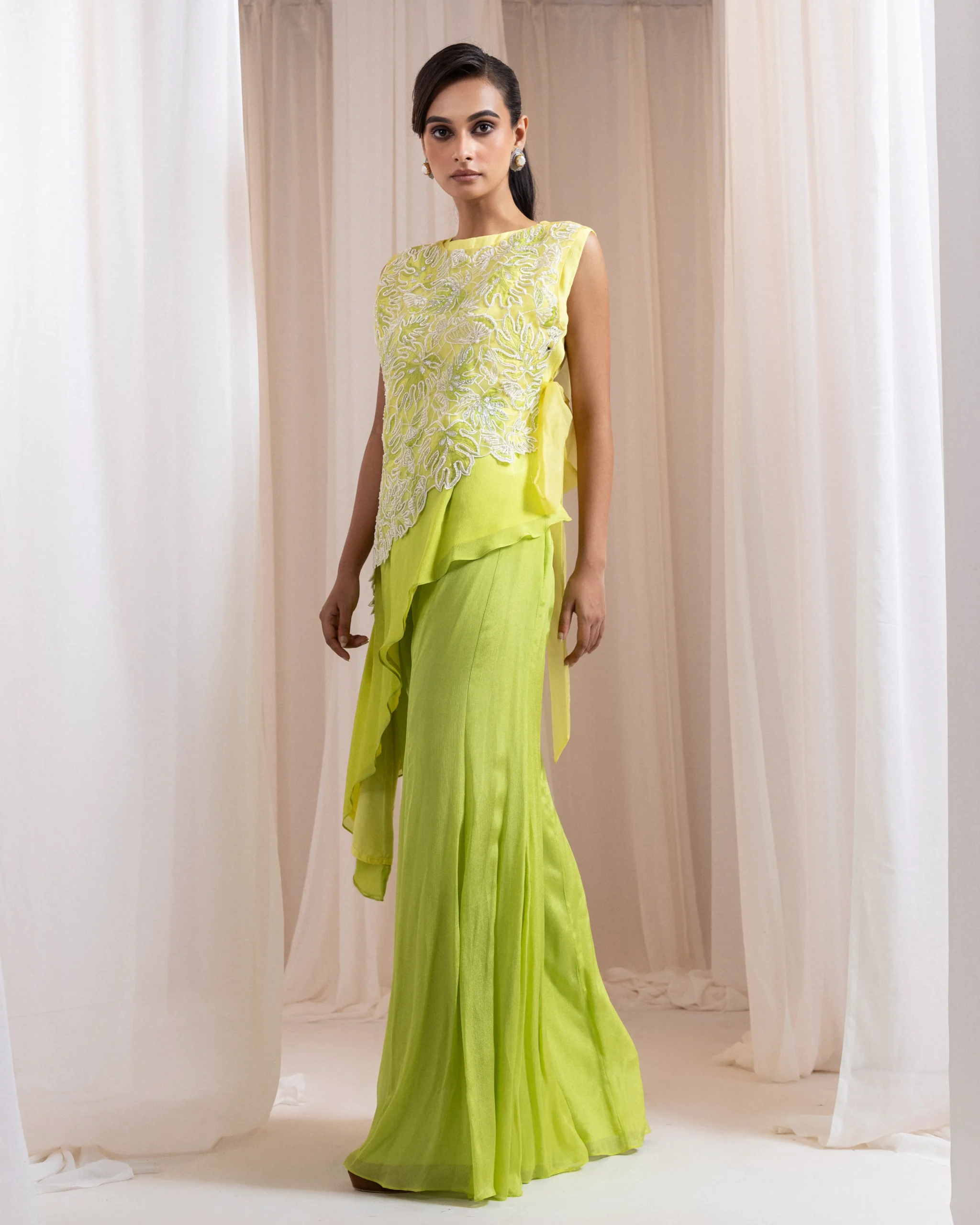 A vibrant lime-yellow three-piece Jacket Pant set featuring an ombré tie-dye high-neck asymmetrical top. It’s layered with a one-sided sheer organza overlay jacket, embroidered with delicate leafy motifs in cutdana, beads, and thread. Paired with wide flared pants, the silhouette is fresh, fluid, and festive. Ideal for mehendi functions, daytime weddings, and summer celebrations.