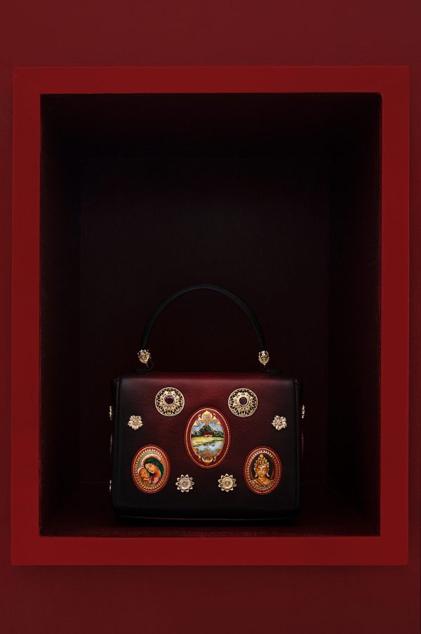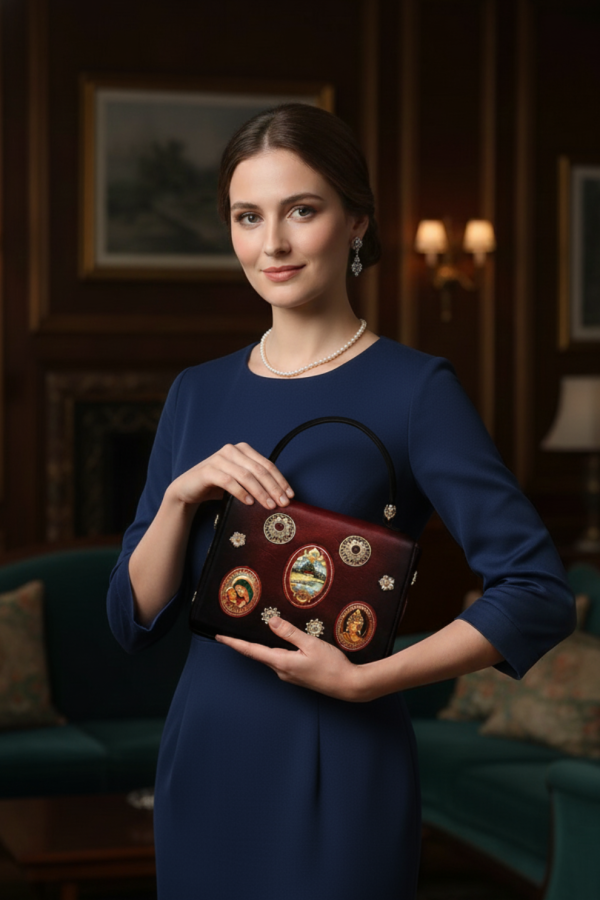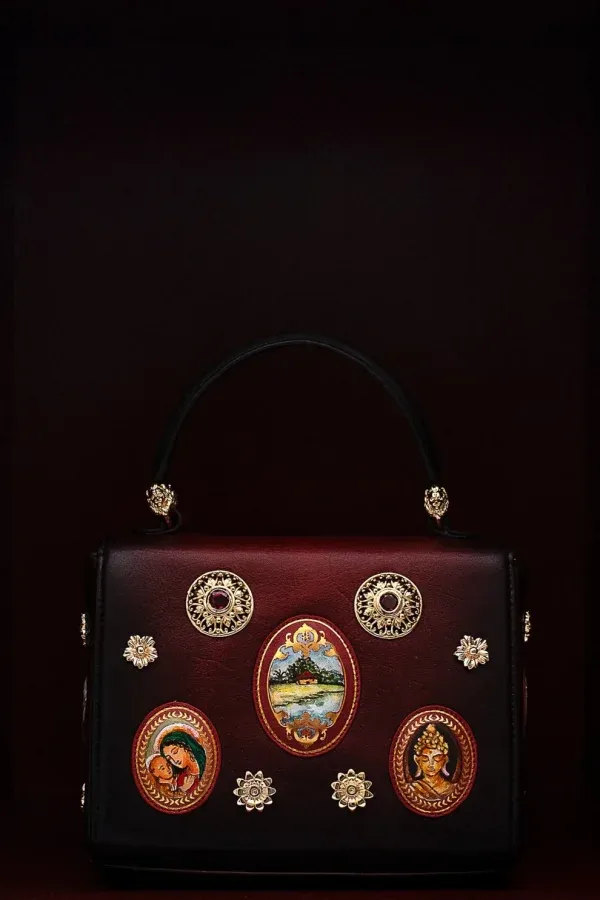 This chic bag redefines style. A must-have for fashion enthusiasts, it elevates any outfit with effortless charm. Experience striking elegance with this mid-blue rectangle-shaped handbag with miniature hand-painted motifs, a gold-plated floral carved brooch, and stone embellishment. It comes with a detachable small sling. Perfect for those who dare to be different, this piece shines with creativity. Its features are embellished and complemented by standard fittings. The bag is secured with a push lock.