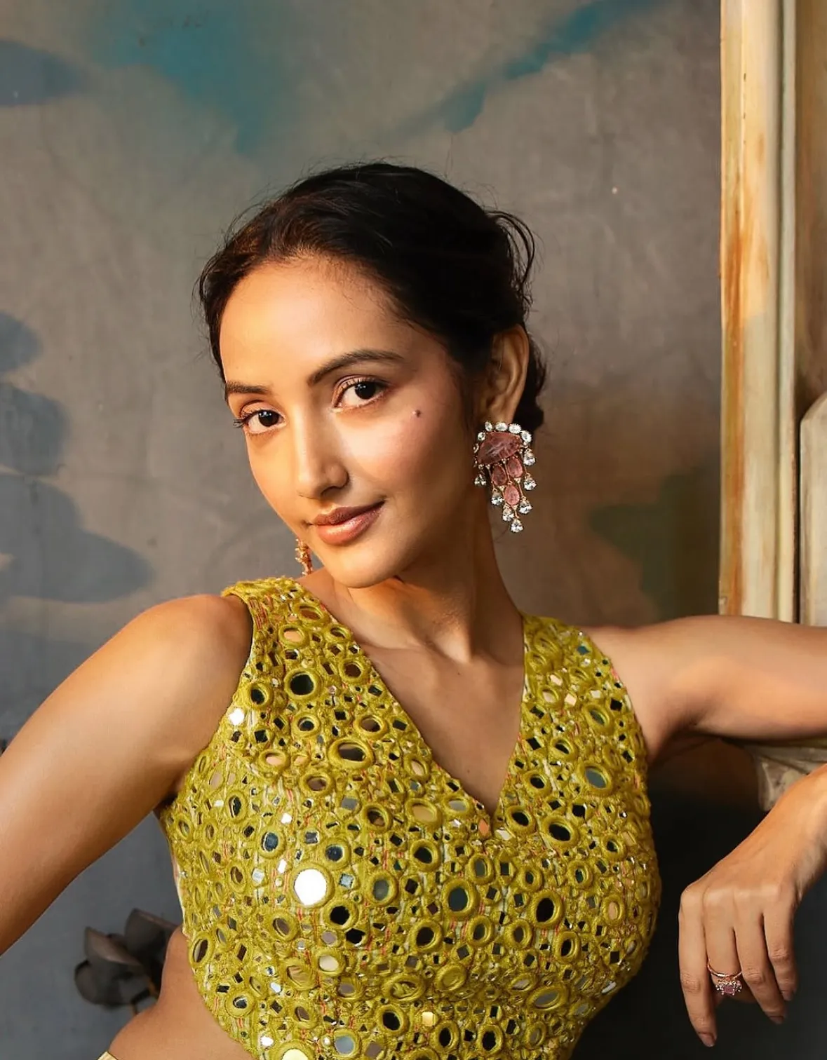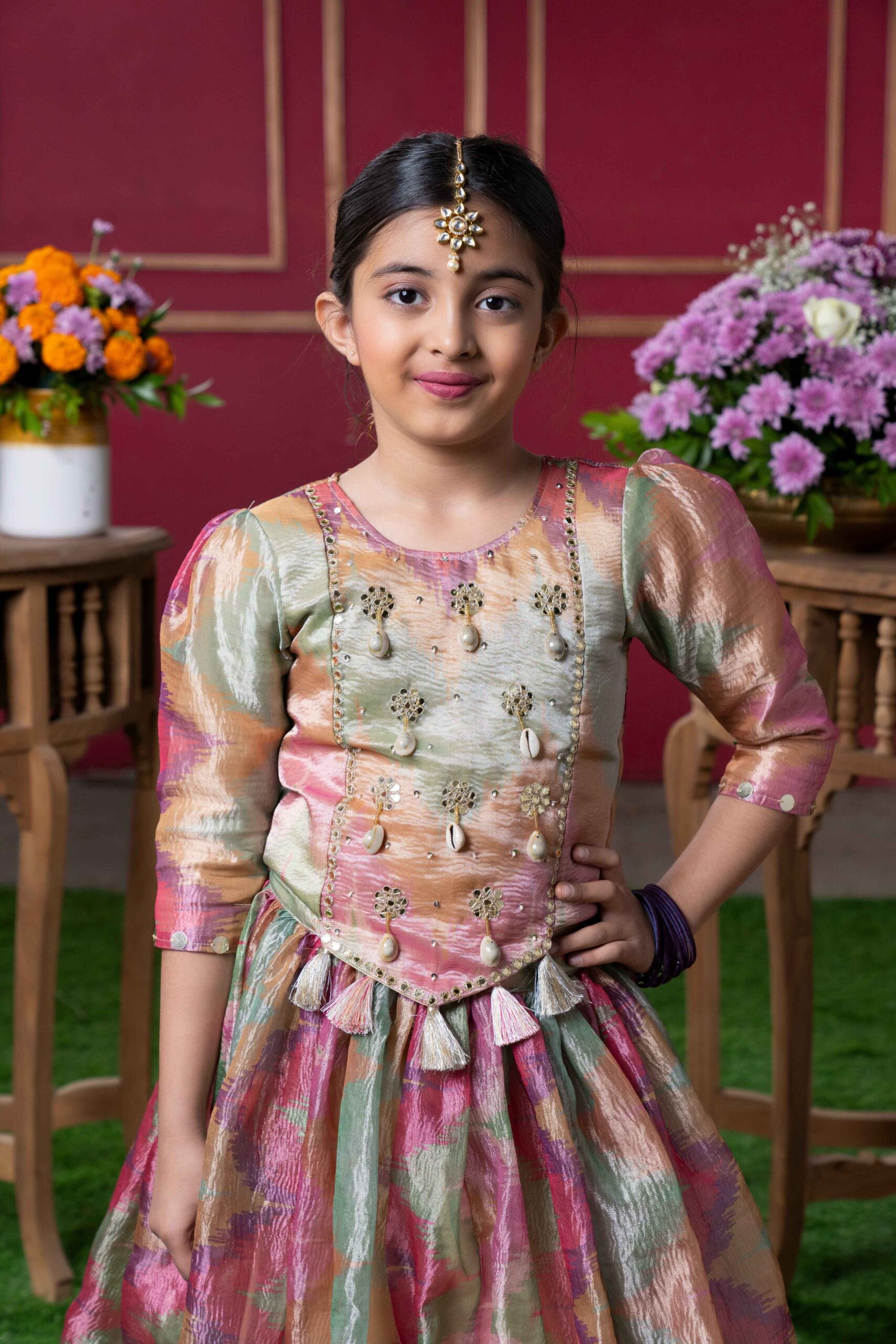 A decorative pleated detail at the waistline enhances the silhouette and adds a stylish flair. The lehenga is a floor-length flared skirt made of flowy metallic fabric in pastel shades of pink, green, and gold, perfectly complementing the top. Its ombre-like color transitions and reflective finish give it a dreamy and elegant vibe, ideal for festive occasions. The skirt is voluminous, providing a princess-like look and is lined with a can-can layer for added structure. The outfit includes a matching potli bag with tassel detailing, offering both style and practicality.