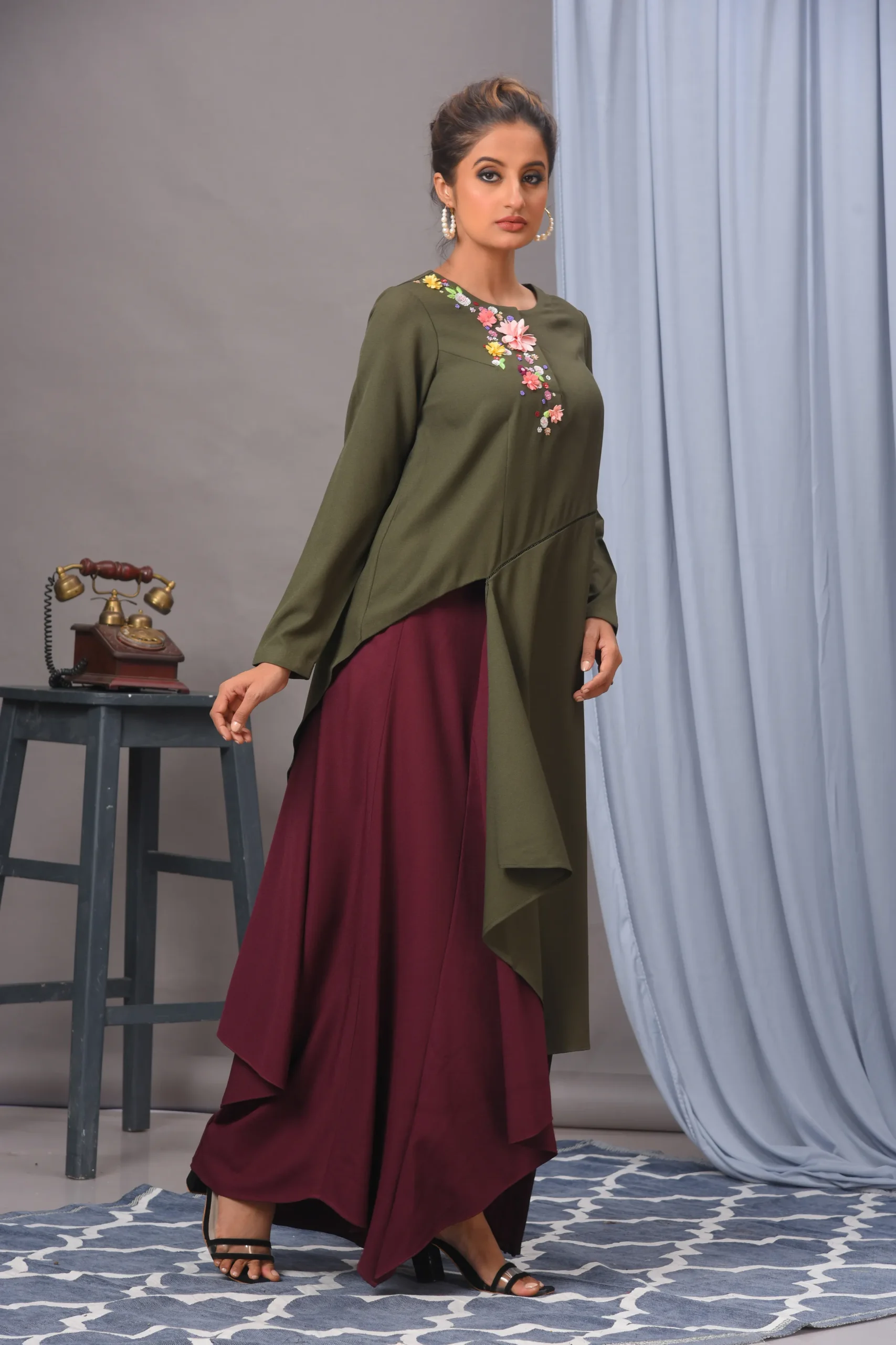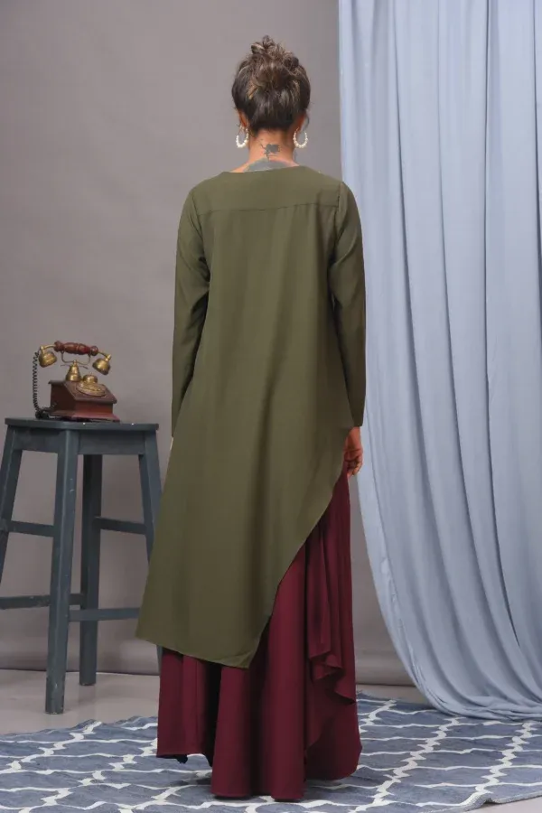 Olive Green & Wine Crepe Asymmetric Embellished Skirt Set