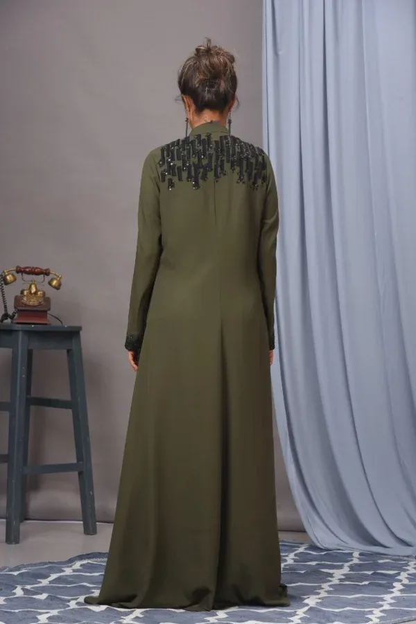 Introducing a stunning olive green moss crepe jacket styled full length front open tunic. The intricate embellishments on the tunic enhance its allure, making it perfect for all occasions. Paired with comfortable black pants, this ensemble strikes the ideal balance between style and comfort, allowing you to move with ease while looking effortlessly chic.