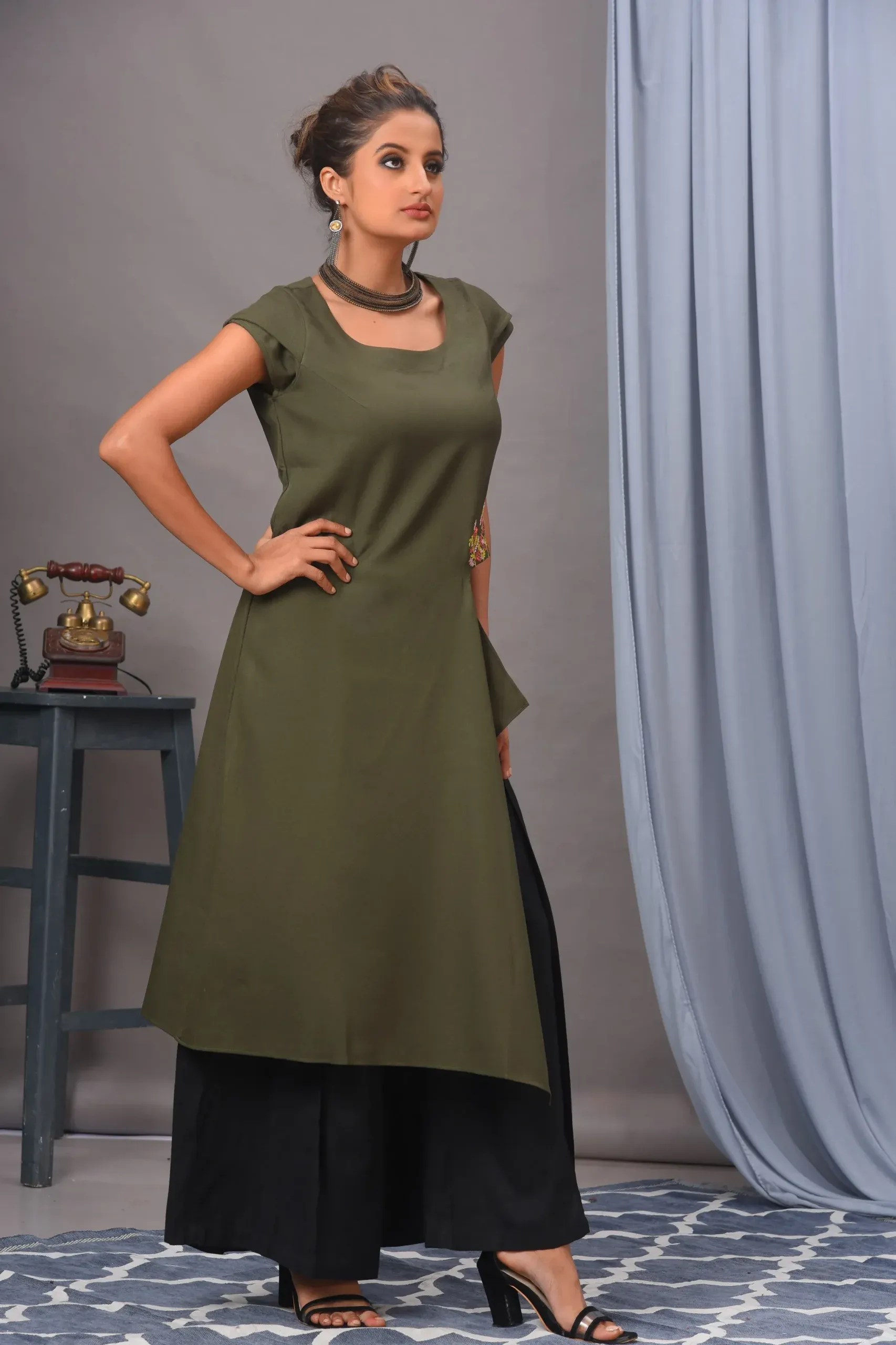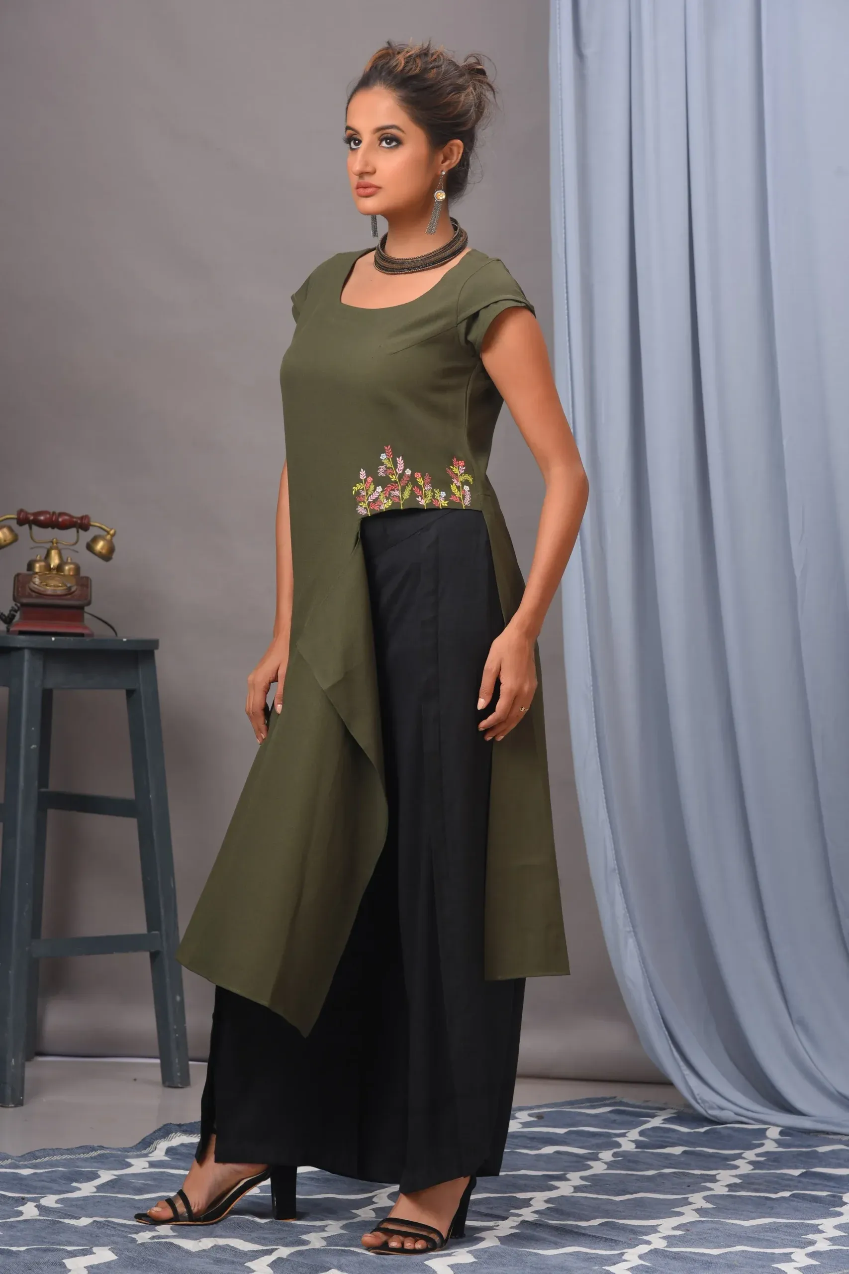 Presenting this exquisite olive green moss crepe stylish tunic set, beautifully adorned with thread work on the waist, to enhance the overall look of the design. It is paired with comfortable black pants. The streamlined look of the pants balances the tunic’s volume, ensuring a flattering silhouette.