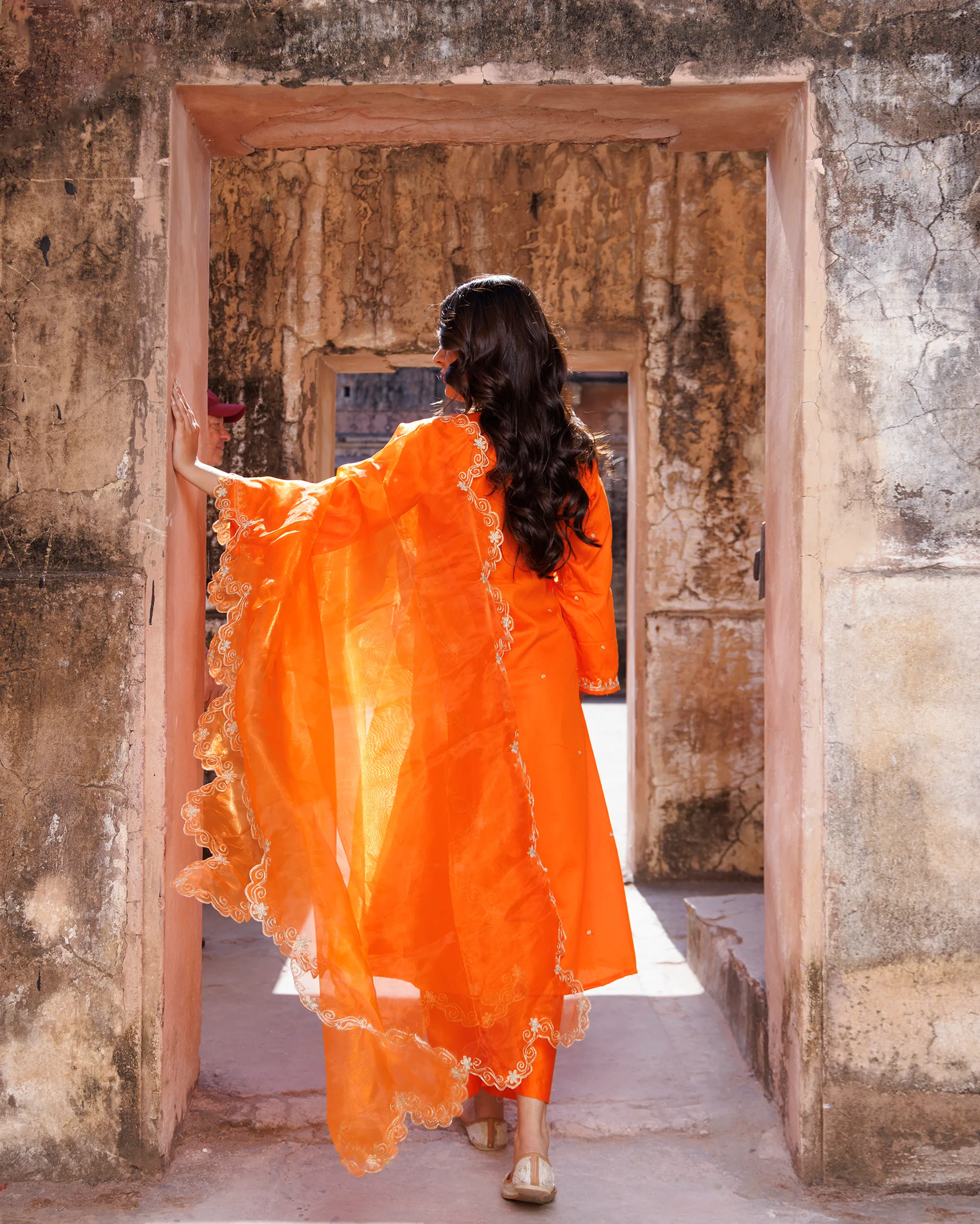 Orange Cotton Silk Kurta Set with Aari Embroidered Organza Dupatta