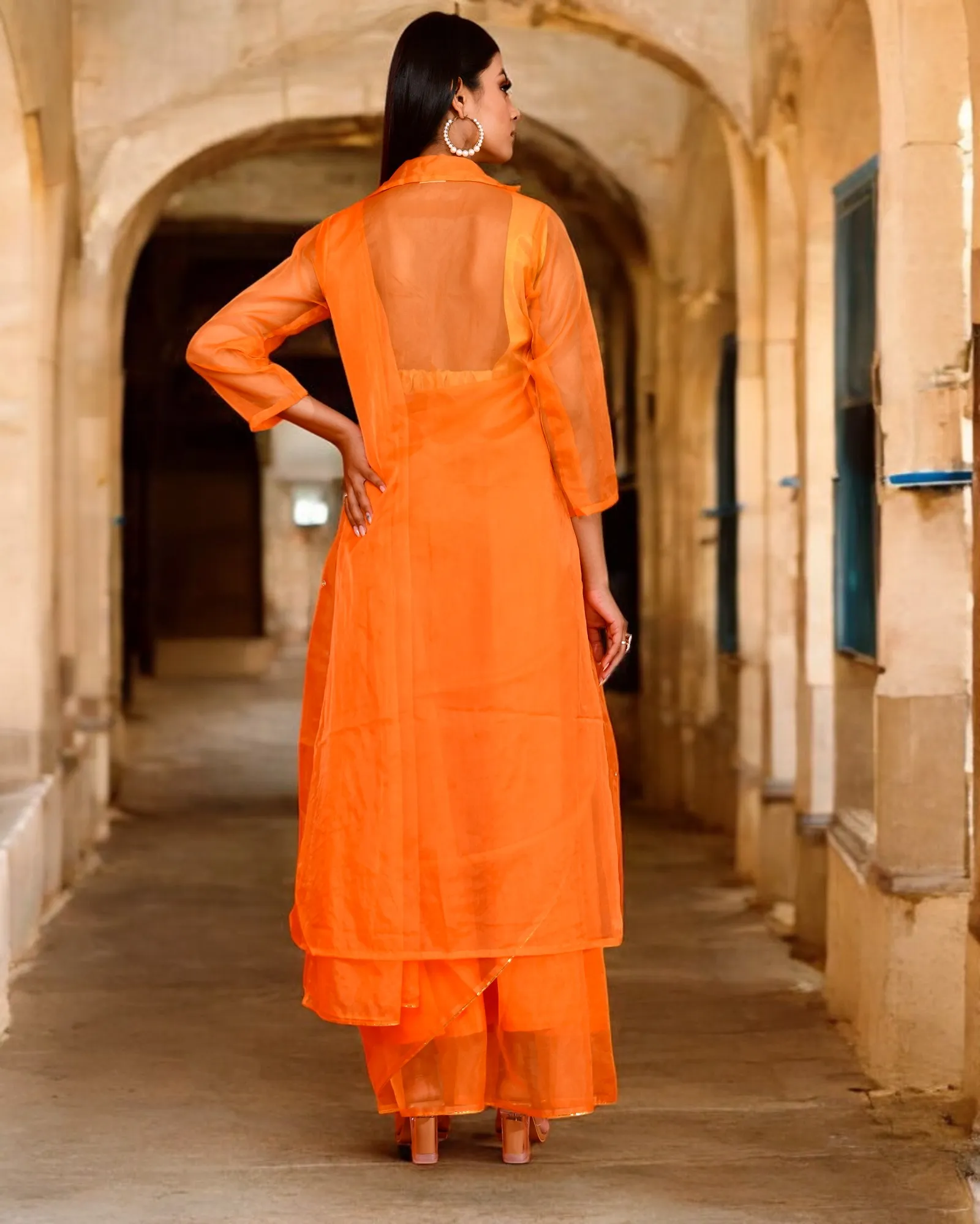 Introducing a refined expression of contemporary elegance, this pastel orange organza saree gracefully blends softness with structure. Crafted in airy organza fabric, it offers a light, fluid drape with a subtle sheen that enhances its modern appeal. Perfect for effortless festive dressing and elegant occasions, this saree embodies understated sophistication and timeless charm.