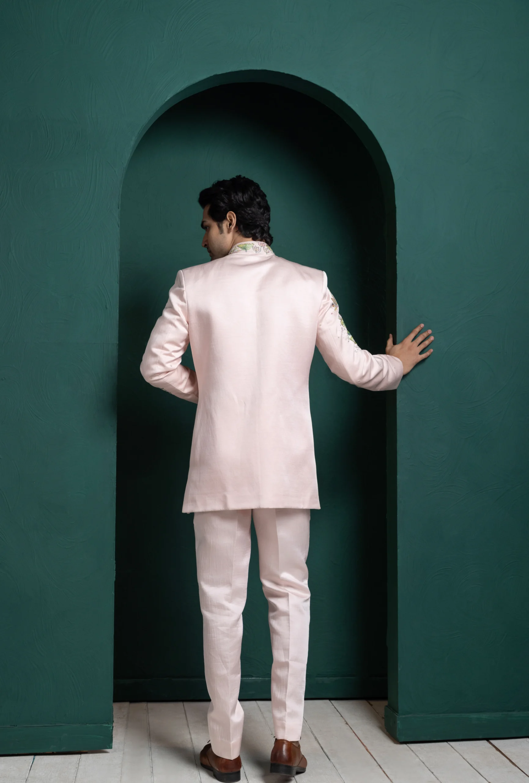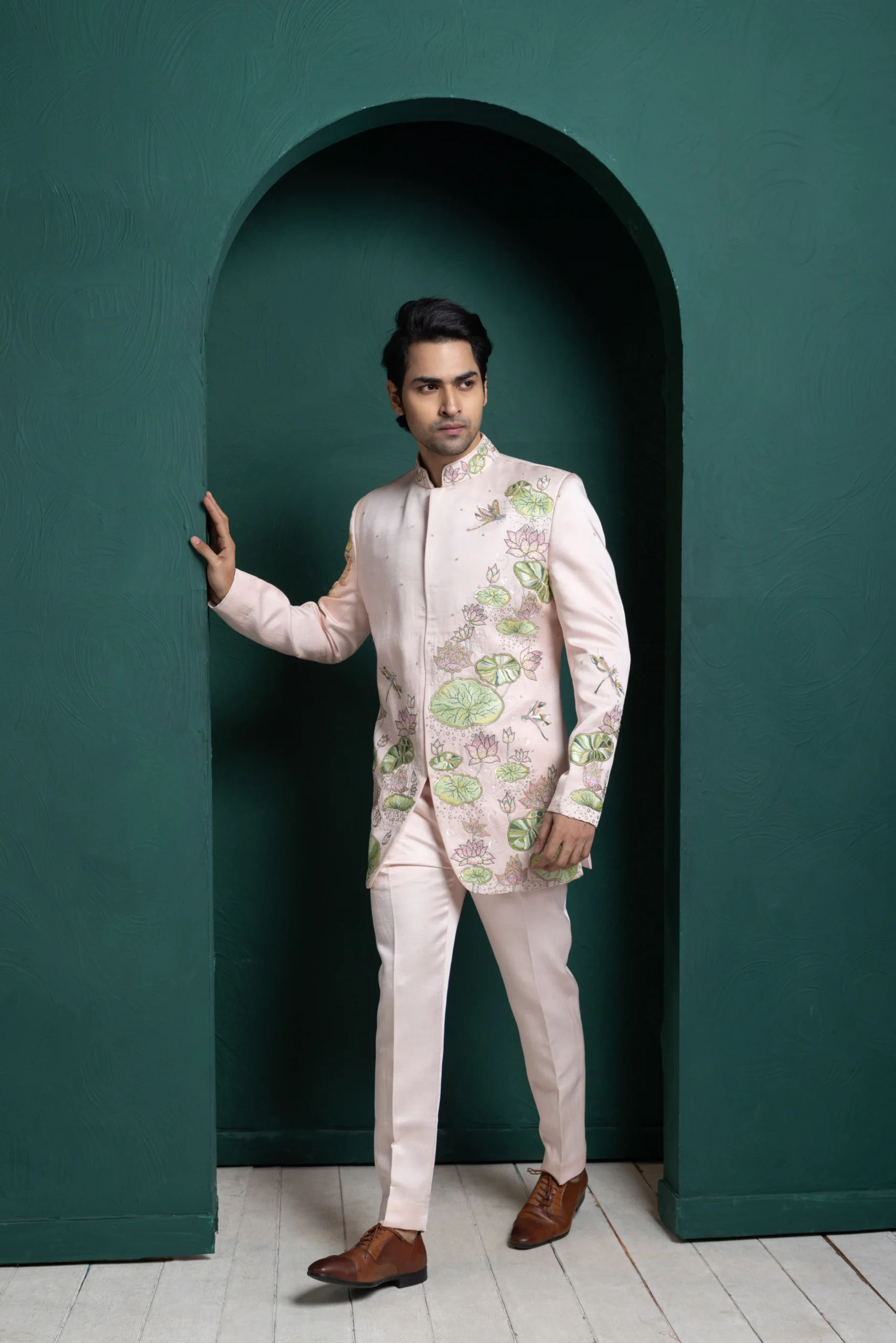 Pastel Pink Embroidered Bandhgala with Lotus & Dragonfly Motifs