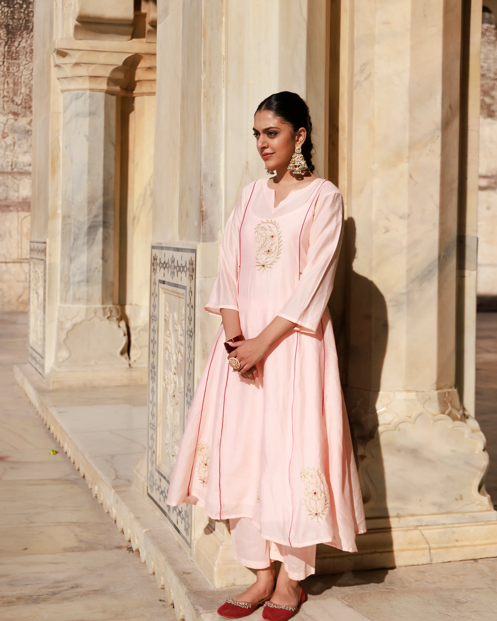 Style with antique gold or pearl earrings to complement the softness of the peach hue. Pair with traditional juttis or nude heels for an effortlessly elegant look.